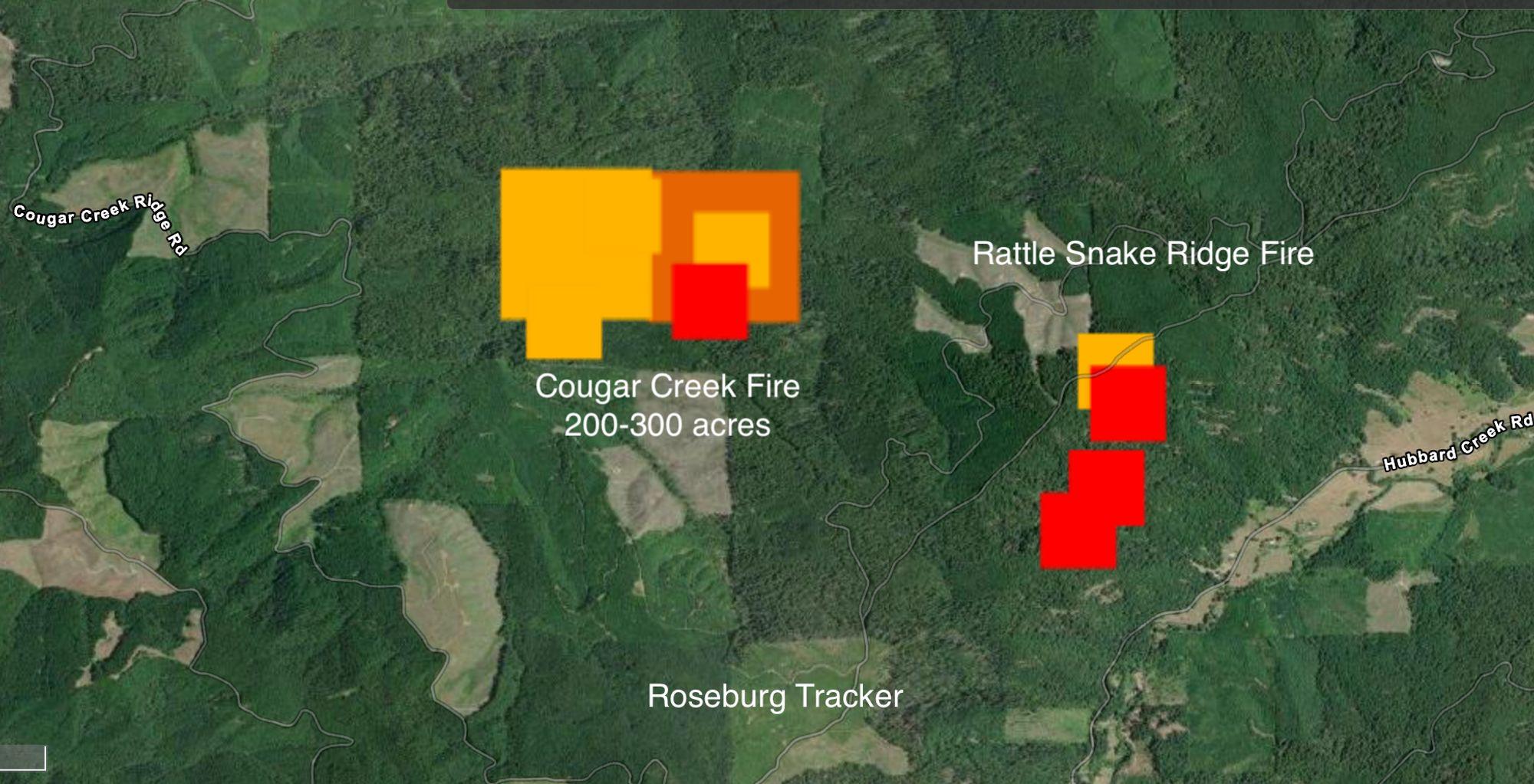 Update 5:30pm - The DCSO has issued evacuation notices to Hubbard Creek Road residents just now. The evacuation map can be viewed here: https://dcor.maps.arcgis.com/apps/webappviewer/index.html?id=c1c9e876f2ed4e1fbfb2eae280b7c57c I'm a little concerned about the Cougar Creek Fire right now as it's grown to 200-300 acres as of the last estimate from the air. It's also threatening to join up with the Rattle Snake Ridge Fire. The most concerning part is both these fires are above Hubbard Creek Road which has dozens of homes along it. More aviation support has apparently been requested.