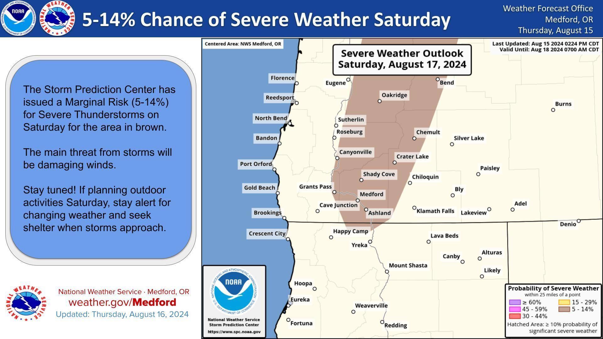 A strong low pressure system will approach Oregon on Saturday. A strong upper level jet stream will accompany the trough, producing significant wind shear. This will aid in the development of thunderstorms and some may become severe with damaging winds. Stay tuned for updates. When thunder roars, head indoors! Via NWS Medford