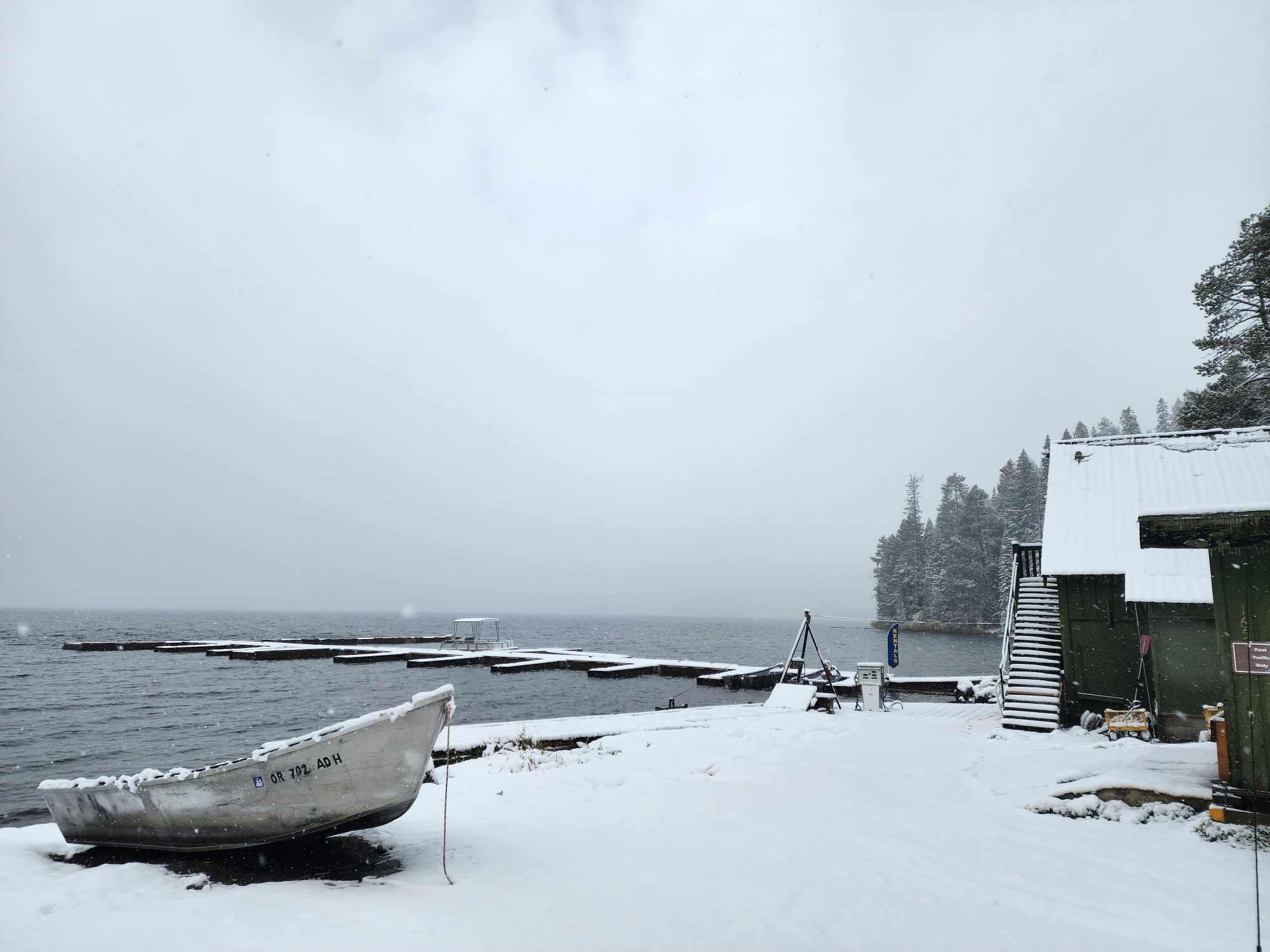Diamond Lake is looking beautiful this morning with the overnight snow! They got about 4 inches of snow by the lake so far as of Thursday morning, more in slightly higher elevations. Forecasts show Diamond Lake could receive another 6-7 inches of snow today and 5-7 inches on Friday. Crater Lake looks they got a bit over 8 inches so far and another 10-13 inches forecast by Friday morning! Photos by Ginger Finch