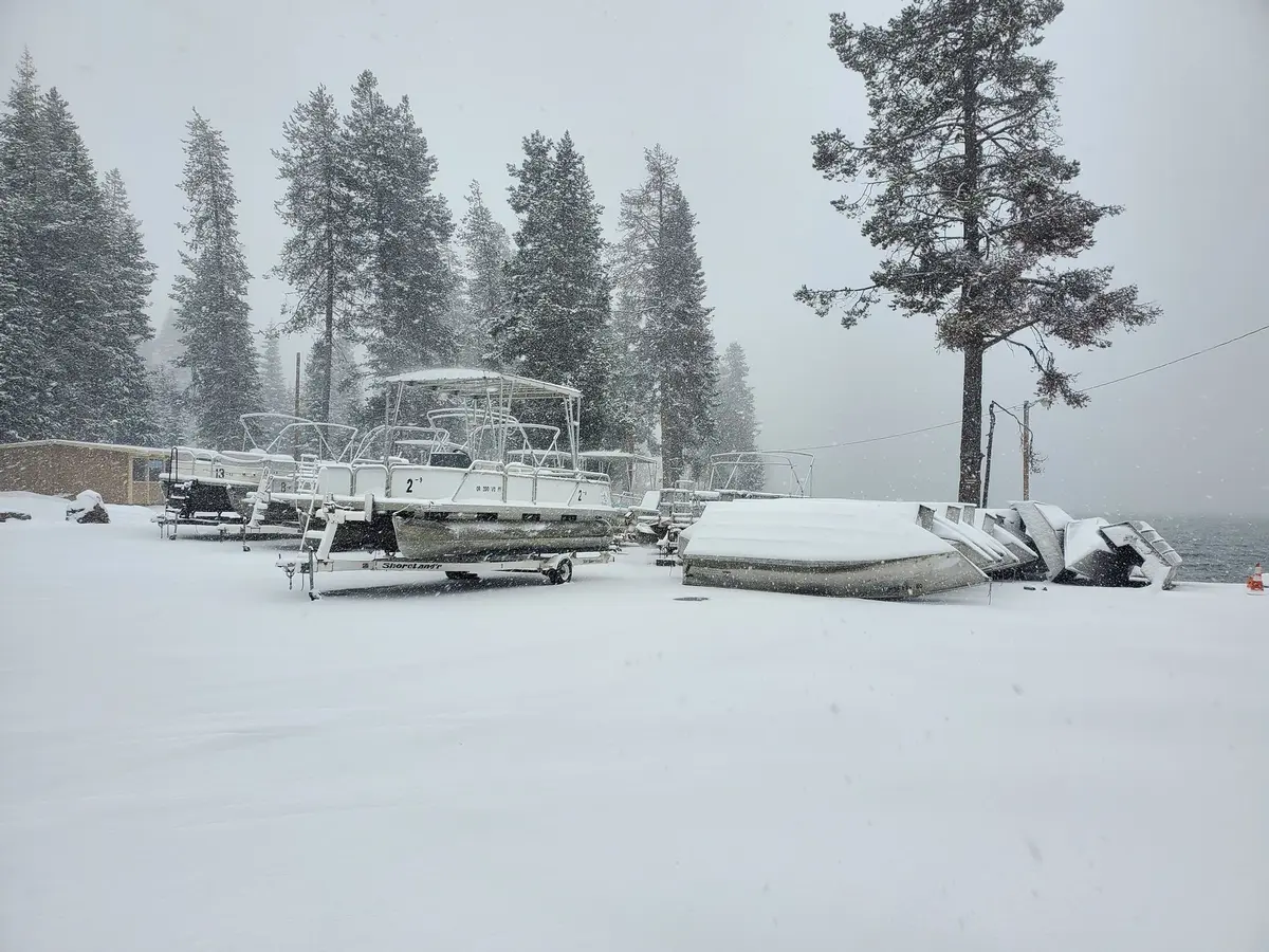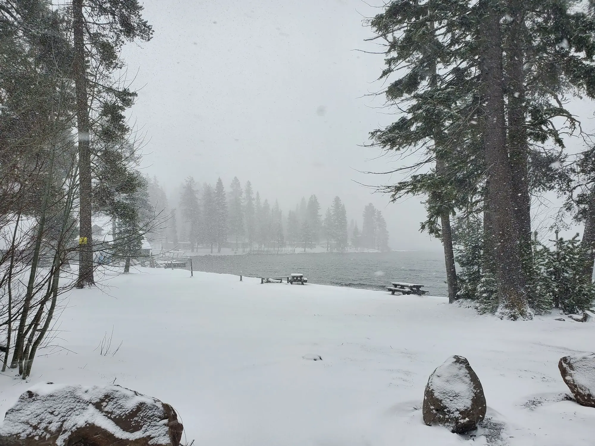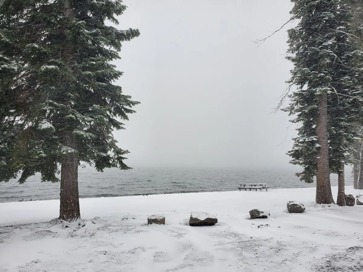 Diamond Lake has received approximately 6 inches of snow already on the north side of the lake near the lodge, with even more reported towards the south end of the lake. It's still snowing hard at the time of this post Sunday morning. Yesterday, there was no snow on the ground between the lodge and the lake as you can see in the 4th photo below. Photos by Ginger Finch