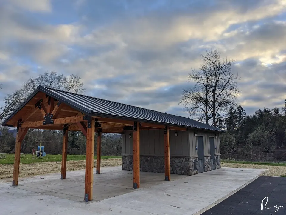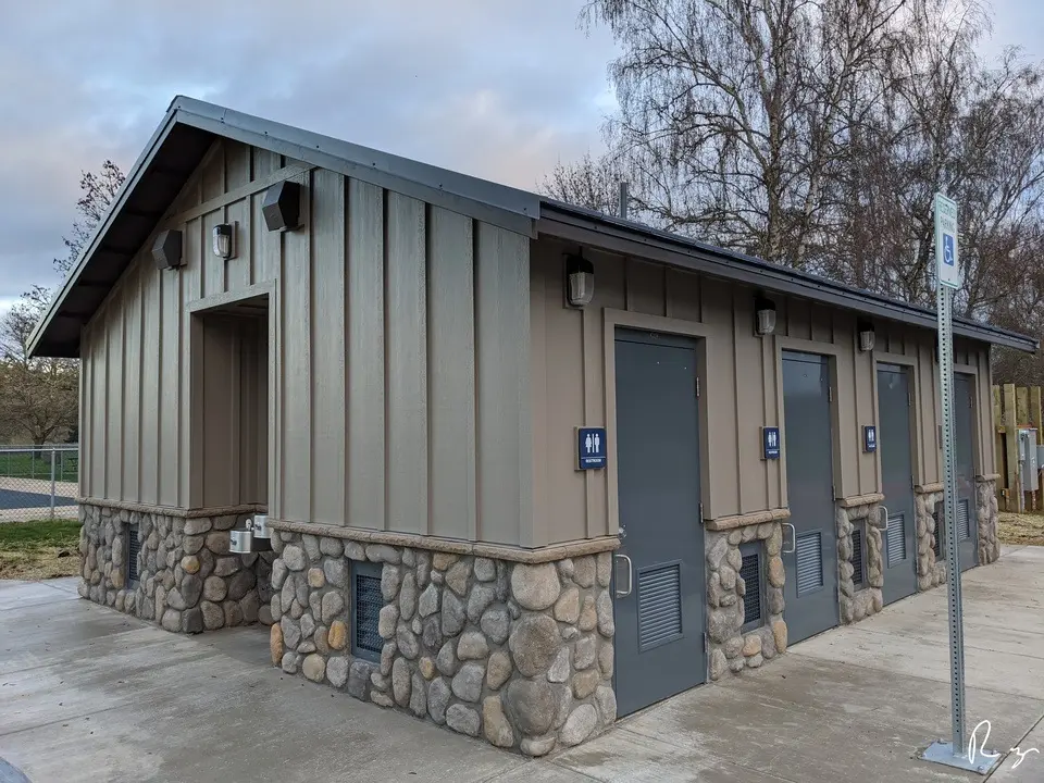 The new bathrooms at River Forks park have been completed. The two facilities were both designed and built by Romtec, a local building manufacturer. The bathroom building located next to the large playground and main pavilion has 8 individual bathroom units, including two wheelchair accessible units. It also has drinking fountains on the side of the building. The building up by the upper playground and fort area has two individual bathroom units as well as a 24 foot long pavilion out at the front portion of the building. Both bathroom buildings look very nice and well constructed. Romtec did an excellent job and these bathrooms will be an excellent addition to the park. The new bathrooms should be open for public use starting this Saturday, February 22nd.