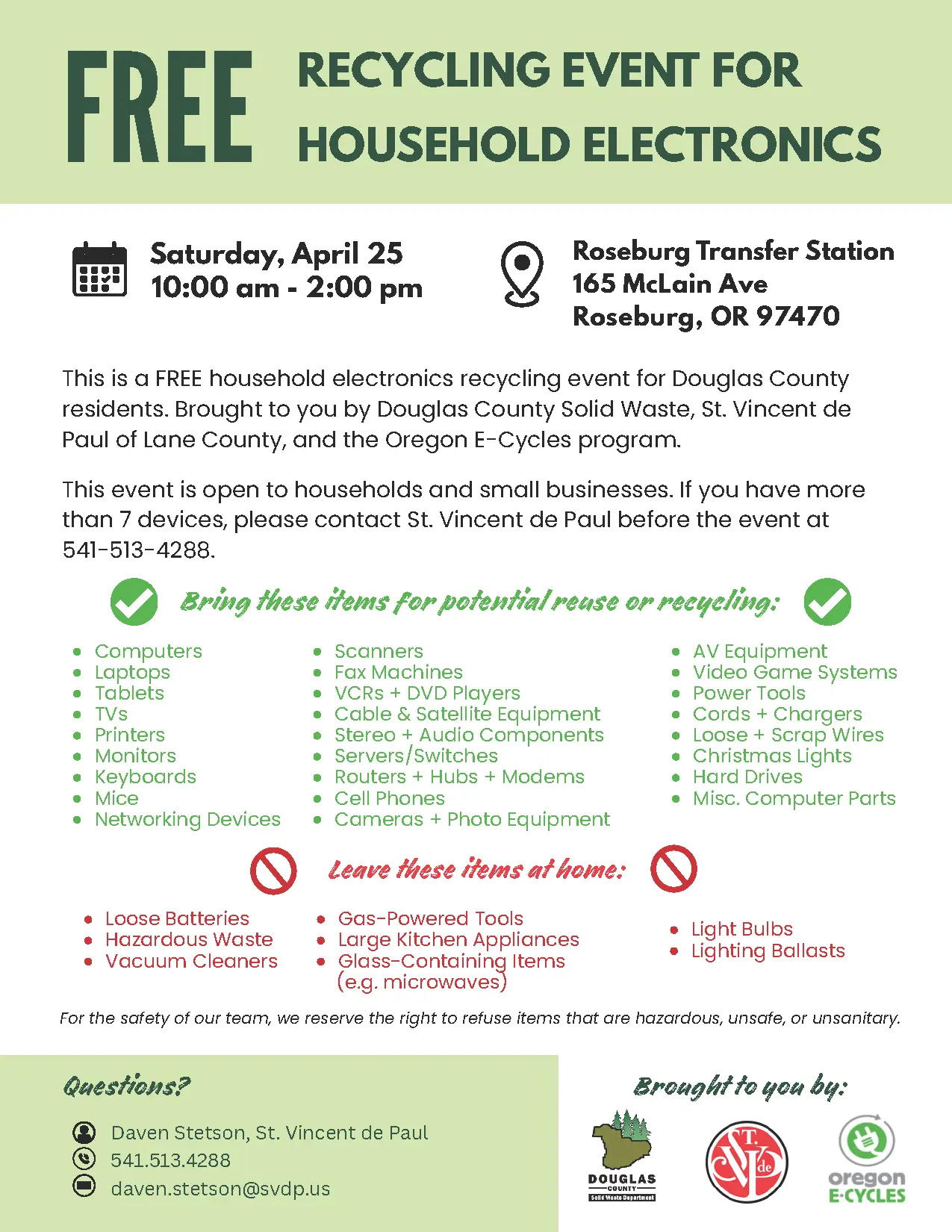 Douglas County residents and small businesses can dispose of unwanted electronics for free at the Roseburg Transfer Station on Saturday, April 25, from 10 a.m. to 2 p.m. The event, organized by the D...