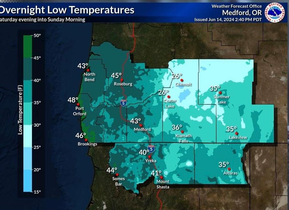 A cold air mass will move over areas east of the Cascades this weekend, bringing overnight lows down to near or below freezing temperatures. Lows will be near freezing in northern Klamath and Lake counties on Friday night, then cold temperatures will move as far south as Shasta Valley and Modoc County on Saturday night. A Freeze Warning is in place for areas east of the Cascades on Sunday from 1 AM to 8 AM. Via NWS Medford