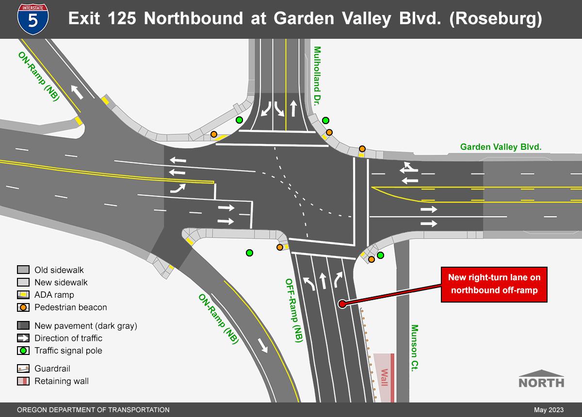 ROSEBURG – The Interstate 5 northbound off-ramp at Exit 125 (Garden Valley) is scheduled to be closed Sunday, Monday, and Tuesday nights, Jan. 28-30, for construction. A three-mile detour will be provided for the 8 p.m. to 6 a.m. closures. Northbound I-5 traffic can continue north and use Exit 127 (Edenbower) to turn around and approach Exit 125 from the southbound direction. On Sunday night, contractors will install a guardrail along the ramp. The following two nights are scheduled for paving, which is weather-dependent and could be postponed due to rain. Roadside message boards are in place and will provide updated closure information. The closures are part of a $2.4 million project that will add a dedicated right-turn lane to the northbound off-ramp, helping to ease congestion and improve safety at the interchange. The project will also replace the traffic signal and upgrade sidewalk curb ramps. Prime contractor Knife River Materials is scheduled to complete work this summer. Via ODOT More information about the project can be found on the project website here: https://www.oregon.gov/odot/projects/pages/project-details.aspx?project=21679