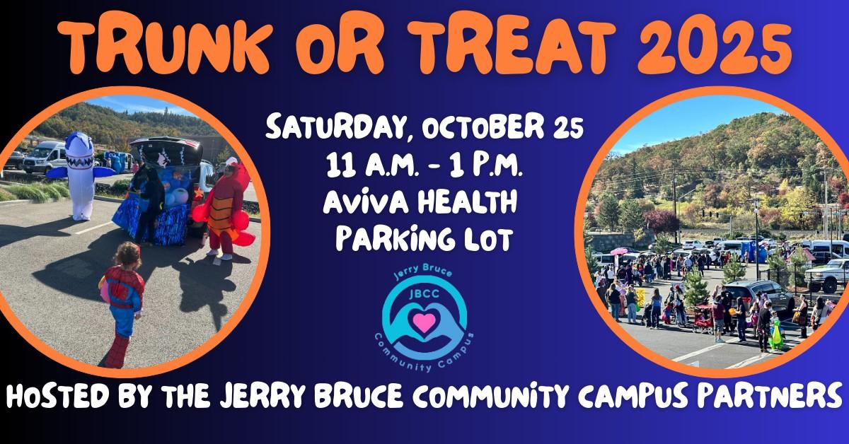 The Jerry Bruce Community Campus will host its fourth annual Trunk or Treat on Saturday, October 25, from 11 a.m. to 1 p.m. in the Aviva Health parking lot. Families are invited to come rain or shine. Dozens of Halloween-decorated vehicles will offer store-purchased treats or toys to all who arrive in costume. Costumes must be family-friendly. This event is brought to the community by the nonprofit partners of the Jerry Bruce Community Campus: The FISH Food Pantry, UHI Inc., Family Development Center, UCAN, and Aviva Health. JBCC decorated trunks only.r