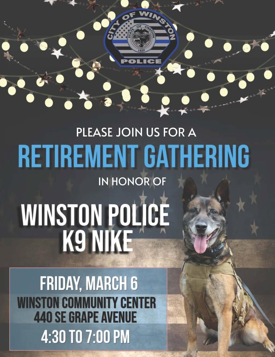 Winston, OR — K9 Nike, a Belgian Malinois who has served in law enforcement for more than eight years, will retire from the Winston Police Department on March 1. Born in the Netherlands in 2016, Nike ...