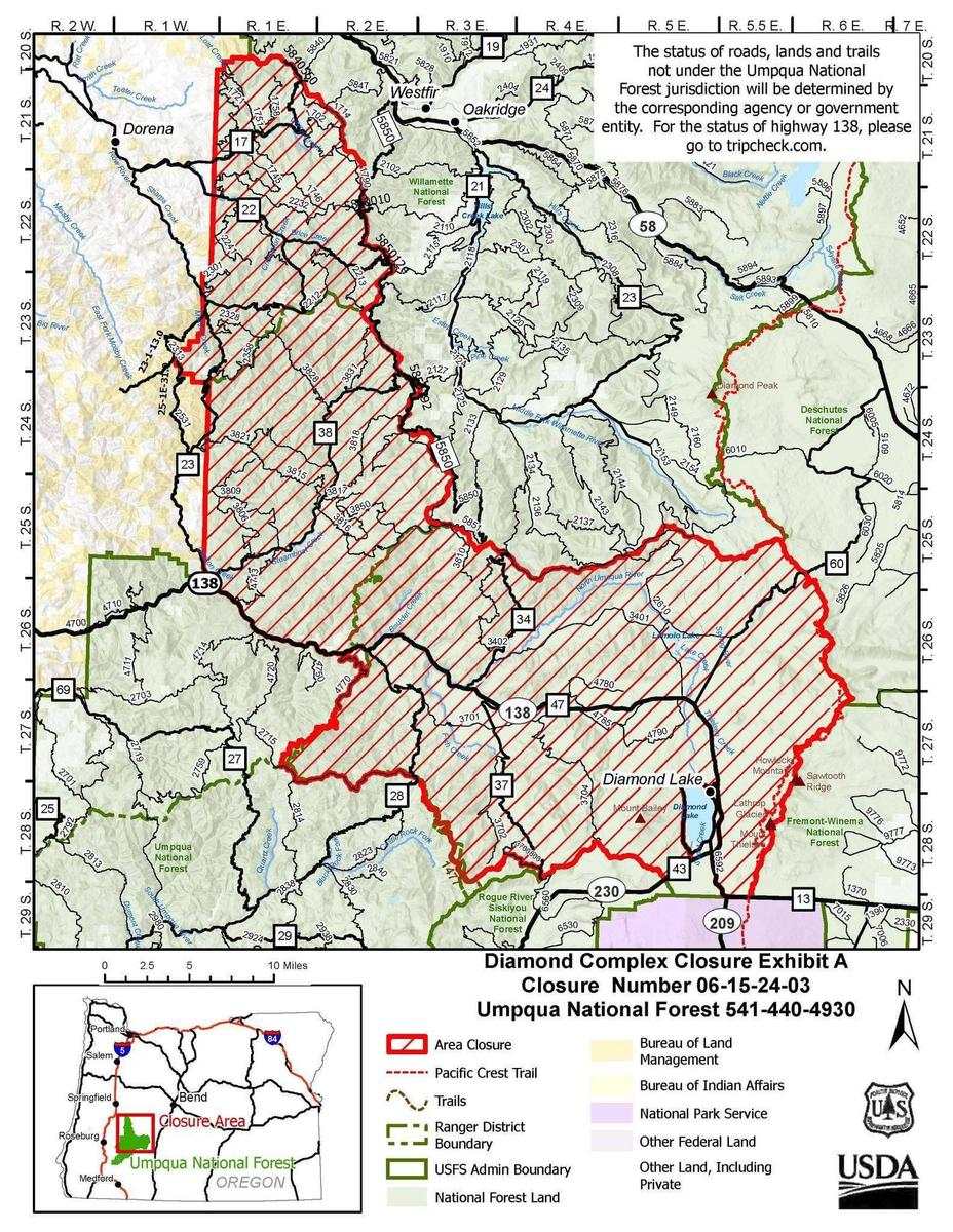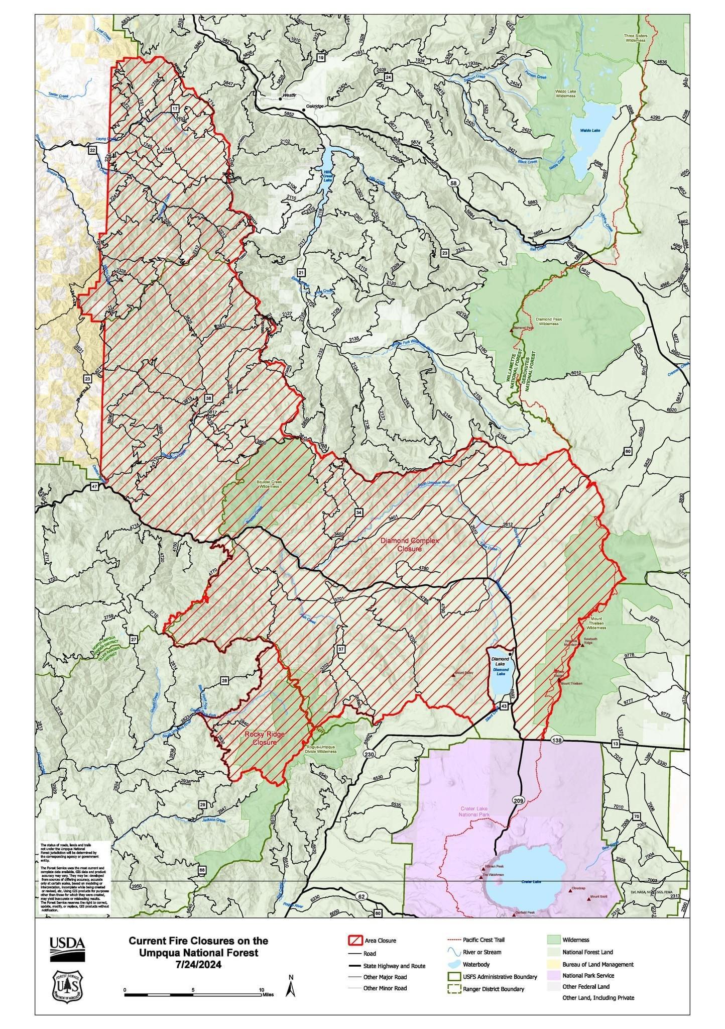 There are two forest closures on the Umpqua National Forest impacting every district of the forest. The visiting public is asked to stay out of all closure areas for public and wildland firefighter safety. Pictured is a combined closure map. The two closure orders are: - Diamond Complex Emergency Fire Closure ORDER NO. 06-15-24-03: https://bit.ly/3SeYvih - Rocky Ridge Emergency Fire Closure ORDER NO. 06-15-02-24-01: https://bit.ly/4ddtjrX ๐๐ผ๐๐๐ฎ๐ด๐ฒ ๐๐ฟ๐ผ๐๐ฒ ๐ฅ๐ฎ๐ป๐ด๐ฒ๐ฟ ๐๐ถ๐๐๐ฟ๐ถ๐ฐ๐ ๐ถ๐ ๐ฐ๐น๐ผ๐๐ฒ๐ฑ. https://bit.ly/3SeYvih ๐ก๐ผ๐ฟ๐๐ต ๐จ๐บ๐ฝ๐พ๐๐ฎ ๐ฅ๐ฎ๐ป๐ด๐ฒ๐ฟ ๐๐ถ๐๐๐ฟ๐ถ๐ฐ๐ ๐ฝ๐ผ๐ฟ๐๐ถ๐ผ๐ป๐ ๐ฐ๐น๐ผ๐๐ฒ๐ฑ. https://bit.ly/3SeYvih ๐๐ถ๐ฎ๐บ๐ผ๐ป๐ฑ ๐๐ฎ๐ธ๐ฒ ๐ฅ๐ฎ๐ป๐ด๐ฒ๐ฟ ๐๐ถ๐๐๐ฟ๐ถ๐ฐ๐ ๐บ๐ผ๐๐๐น๐ ๐ฐ๐น๐ผ๐๐ฒ๐ฑ. https://bit.ly/3SeYvih and https://bit.ly/4ddtjrX ๐ง๐ถ๐น๐น๐ฒ๐ฟ ๐ฅ๐ฎ๐ป๐ด๐ฒ๐ฟ ๐๐ถ๐๐๐ฟ๐ถ๐ฐ๐ ๐ฝ๐ผ๐ฟ๐๐ถ๐ผ๐ป๐ ๐ฐ๐น๐ผ๐๐ฒ๐ฑ. https://bit.ly/3SeYvih and https://bit.ly/4ddtjrX Some popular recreation sites that are included in the closure order: - Bohemia Mining District - Brice Creek Trailhead - Umpqua Hot Springs - Watson Falls - Toketee Falls - Toketee Lake - Mt. Thielsen Trail - Lemolo Lake - Boulder Flat Campground, Trailhead, and Boat Launch - Castle Creek Trailhead - Skimmerhorn Trailhead - Fish Lake Trailhead - Beaver Swamp Trailhead - Acker Divide Trailhead To see a full list of recreation sites, visit: https://www.fs.usda.gov/recmain/umpqua/recreation Additionally, Diamond Lake, Thielsen View, and Broken Arrow Campgrounds, Diamond Lake Boat Launches, and Diamond Lake Visitor Center are closed under an Administrative Closure until July 28, 2024, and will be reevaluated closer to that date. Via U.S. Forest Service Umpqua National Forest