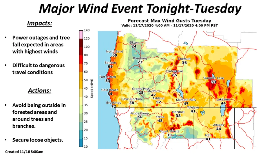 (NWS) A major wind event is shaping up for southern Oregon and northern California. Damaging winds are expected for the coast; high terrain of the Cascades, Siskiyous, and Warners; portions of the East Side like Winter Rim and Summer Lake; and for our south-north or southeast-northwest oriented valleys like the Shasta Valley and portions of the Rogue Valley. Gusty winds are expected elsewhere. (Other valleys will be sheltered from the strongest winds, but may still be gusty.) For the latest forecast discussion: https://www.wrh.noaa.gov/total_forecast/getprod.php?new&prod=XXXAFDMFR&wfo=mfr