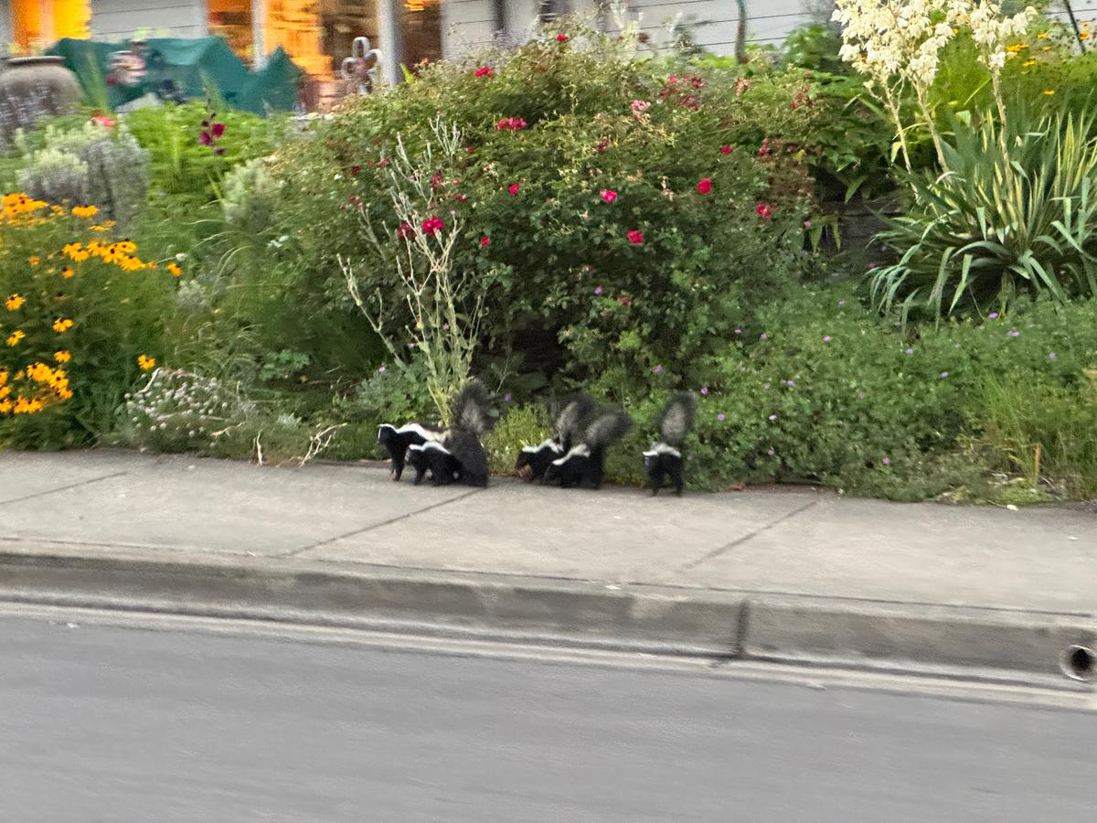 A momma skunk and her five babies out for a stroll this evening. 🦨