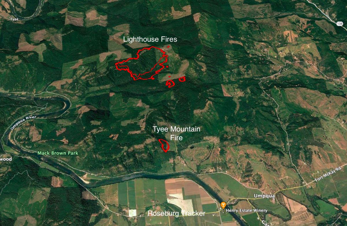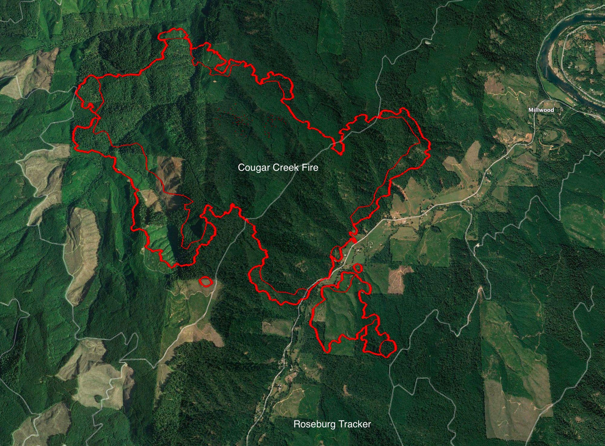 Here is the latest IR overflight map of the area's fires for Monday morning August 28.. Cougar Creek #1: 2,444 acres (+548 interpreted acres) Intense heat is pushing the fire front on all sides of the heat perimeter. Scattered heat persists throughout the interior of the fire. The fire has crossed Hubbard Creek and continues to drive upslope north of Buffalo Creek towards Green Butte. Lighthouse #1: 7 acres / Lighthouse #2: 9 acres / Lighthouse #3: <1 acre / Lighthouse #4: 291 acres Two additional spots not yet named were detected and mapped. Both are less than 1 acre. The intense heat of the fire front along the south side of Lighthouse #4 is moving it towards the other three Lighthouse fires. Tyee Mountain: 13 acres Intense heat is present throughout the entire fire.
