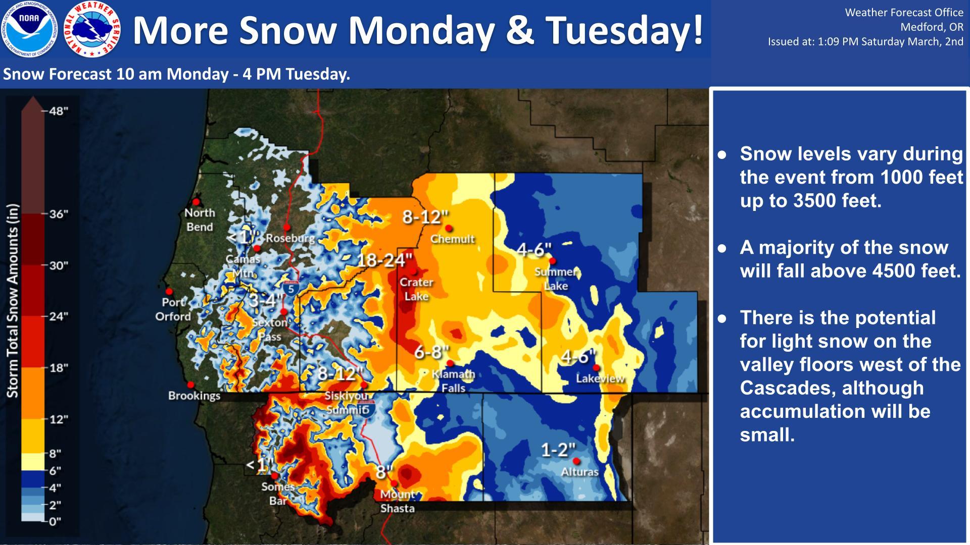 The snow showers will persist through the weekend, although another round of heavy snow will hit the region around Monday and Tuesday. The snow will be fairly heavy above 4500 feet as one can see in the graphic. Some snow will make it down to the 2000 foot range with accumulation over the lower passes. Here is the latest forecast discussion from the NWS in Medford: National Weather Service Medford, OR 302 PM PST Sat Mar 2, 2024 SYNOPSIS: A long-duration winter storm will continue to bring moderate impacts to southern Oregon and northern California, with the biggest snow accumulations closer to the coast. Another low and warm front will bring additional significant snowfall to the area Monday into early Tuesday. Major travel disruptions are possible on Monday evening and Monday night. SHORT TERM: A very cold and unstable airmass persists over the forecast region this afternoon and not much will change over the next 24 hours or so. A deep low bringing all this cool and unstable air remains well offshore and isn’t moving anywhere anytime soon. Snow on the valley floors still remains a concern tonight as snow levels crash down to 500 feet, although models appear a little drier for this next wave with less than 1 inch of snow on the valley floors and slightly higher totals above 2000 feet. By late Sunday morning and afternoon, a short wave embedded in this low will push onshore later Sunday afternoon, which should lead into another jump of precipitation and more coverage in showers. However, breaks in the showers and the sun briefly hitting the valley floors will hopefully diminish the risk of significant accumulating snow at lower elevations, which has happened the last two days. We are forecasting highs in the lower 40’s within the west side valleys on Sunday. Snow levels will rise to ~2000 feet with what weak surface heating we do have and any impacts should really be above that level. Therefore, we opted to keep the winter weather advisory at 2000 feet through most of Sunday for valleys west of the Cascades. Closer to the coast in eastern Curry and western Josephine County, snowfall will remain heavy tonight, especially at elevation. We opted to continue the winter storm warning for those locations as well as western Siskiyou County. The valleys in western Siskiyou County are difficult as it could be cold enough that heavy snow makes it to the valley floors. So that warning could be pushed down to a lower elevation on an update later this evening. However, things become a little more interesting on Monday as a warm front and perhaps weak surface low hit southern Oregon and northern California. That is discussed in more detail below. LONG TERM (Monday 3/4 through Friday 3/8): The long term starts with yet another in the long line of winter storms moving into the region. The GEFS ensembles start Monday in remarkably good agreement with over 90% of the GEFS solutions showing a deeper and continued cold upper trough over the area with a shortwave moving down around the base of the trough. This pattern would result in light to moderate showers across the area while the deeper moisture remains just to the south on Monday. Almost all of the ensemble solutions are indicating another winter storm moving into the region with the upper trough positioned slightly further north and a low moving in from the west bringing a front and additional moisture into the area Monday into Tuesday. This will likely result in more rain and snow across the area. Both solutions favor snow levels rising during the day Monday, starting out around 1000 to 2000 feet Monday morning then rising to between 2500 to 3500 feet Monday afternoon. Then further west, while all of the ensemble plots indicate an upper trough moving towards the coast, around 40% of the ensemble plots indicate a weak upper low winging in with it. Either way, a frontal system approaches, remaining just south of the area as it moves inland, with the upper low to the south wrapping moisture into mostly northern California later Tuesday. The majority of the GEFS solutions favor lower snow levels but favor lighter rain and snow amounts, with limited to moderate impacts from snow showers over the area. Heading into mid-next week, ensemble 500 plots begin to diverge more, but the vast majority (>90%) indicate a ridge building over the region and remaining into the end of next work week before shifting east with another system moving in next weekend. Ensemble meteograms for both the EC and the GFS are also in agreement with over 90% of members indicating no precipitation for the majority of the region during this time period. -Sven Via NWS in Medford