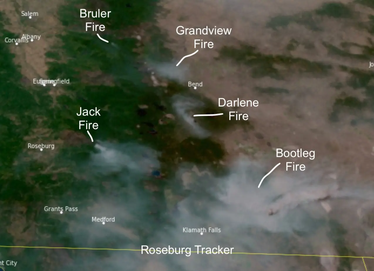 #DarleneFire (new) 100 acres #GrandviewFire 5,723 acres #BrulerFire -100 acres #JackFire - 13,795 acres #BootlegFire - 201,923 acres