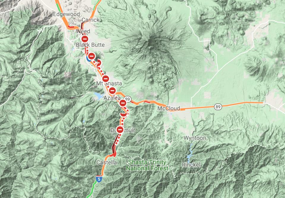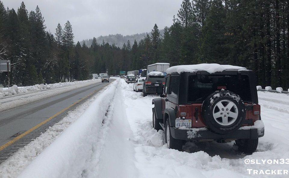 Update: Northbound I-5 is open all the way through the Oregon border. No chains required at this time. I-5 Northbound is still closed at the Fawndale exit 10 miles north of Redding. Reports of 60-200 vehicles are stuck on I-5 northbound between Castella and Dunsmuir, due to a jackknifed big rig and other disabled vehicles in the roadway. These vehicles need to be moved out of the way before the snow plows are able to clear the highway. As of 10:30am things are not looking good. I-5 SB at Ashland: OPEN. Chains required for all vehicles except 4x4s, unless towing. Expect slow traffic & congestion until the back-up clears. Expect winter driving conditions. First photo is of the current gridlock on I-5 20 miles south of Weed. Via @slyon33