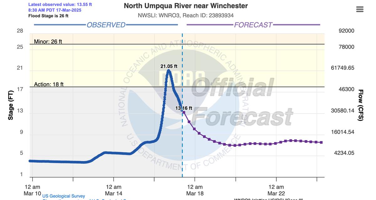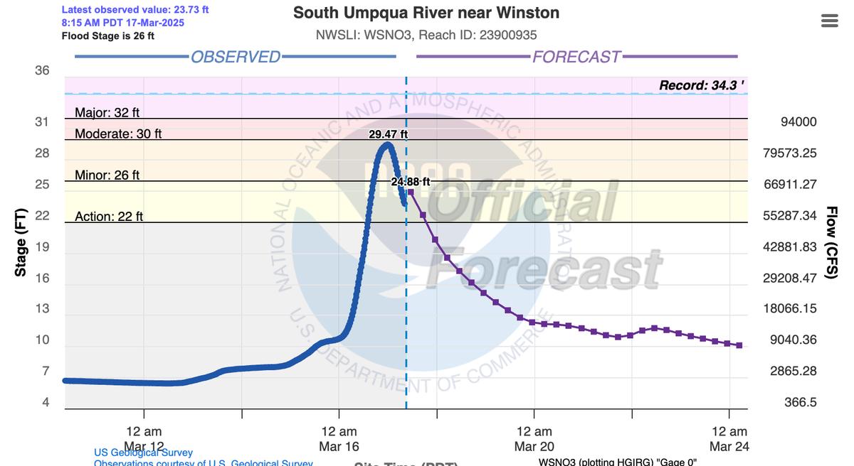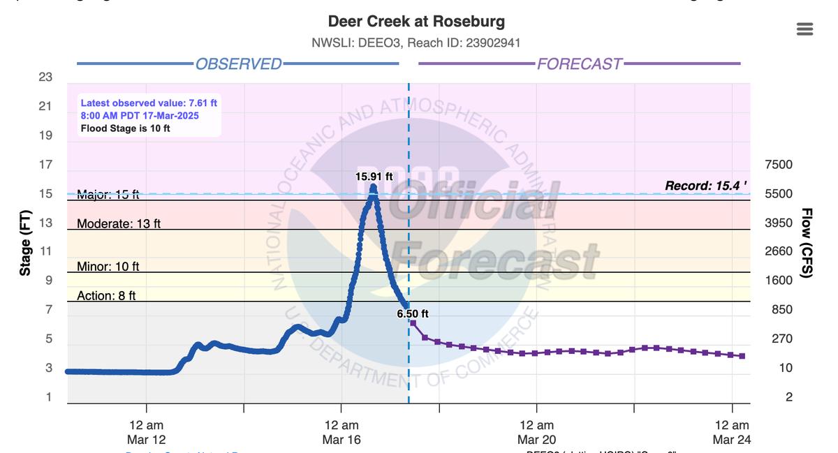Yesterday, Roseburg received 3.47 inches of rain between 1 AM on March 16th and 1 AM on March 17th, smashing the previous daily record of 0.87 inches set back in 1932. The deluge didn’t just break records—it obliterated them, claiming the title of the wettest single day in March history, surpassing the old mark of 2.29 inches from March 21st, 2012. By 1 AM on the 17th, the month’s total rainfall had already climbed to 6.95 inches, making this the third-wettest March ever recorded in the city—and with half the month still to go, it’s closing in on the all-time high of 8.65 inches set in 2012. Sunday's record rain was on top of several days of rain leading up to Sunday. Wednesday - .87 inches Thursday - .23 inches Friday - .93 inches Saturday - .97 inches Sunday - 3.47 inches More rain is expected this week, but fortunately the rivers and creeks are not expected to rise from these rains and the water levels should continue to drop, according to the NWS in Medford. Deer Creek officially reached 15.91 feet, breaking the all time record of 15 feet 4 inches. As of Monday morning at 9am, Deer Creek has dropped to 7.61 feet. The South Umpqua River officially reached 29.47 feet, cresting at 11:45pm before it started dropping. This is the highest the South Umpqua has been since 1983 when it reached 30.32 ft on Feb 18th of that year. As of Monday morning at 8:15, the South Umpqua has dropped to 23.73 feet. The North Umpqua River officially reached 21.03 feet and crested at 4:45pm. As of Monday morning at 8:30am it has dropped to 13.55 feet. Here are the NOAA projections for creek and river levels issued on Saturday the 15th, for Sunday the 16th and how they held up. Deer Creek was projected to reach 12.5 feet. It reached 15.91 feet over 3 feet higher than projections and setting a new all time record. These last three feet were very destructive to homes and businesses along Deer Creek. There was no official mention of Newton Creek in the flood warnings, which flooded just as bad as Deer Creek. Everyone should know to prepare accordingly next time Deer Creek has flood warnings, as they should also be attributed to Newton Creek. There was a lot of destruction along Newton Creek, possibly more than Deer Creek as Newton Creek damaged an apartment complex and homes in several densely populated neighborhoods. South Umpqua was projected to reach 20.5 feet. It reached 29.47 ft, almost 9 feet higher than projections. This was a significant miss. The South Umpqua flooding wasn't really on our radar at all, with projections almost 6 feet below flood stage, to three and half feet over flood stage. North Umpqua was projected to reach 18 feet. It reached 21.03 feet.