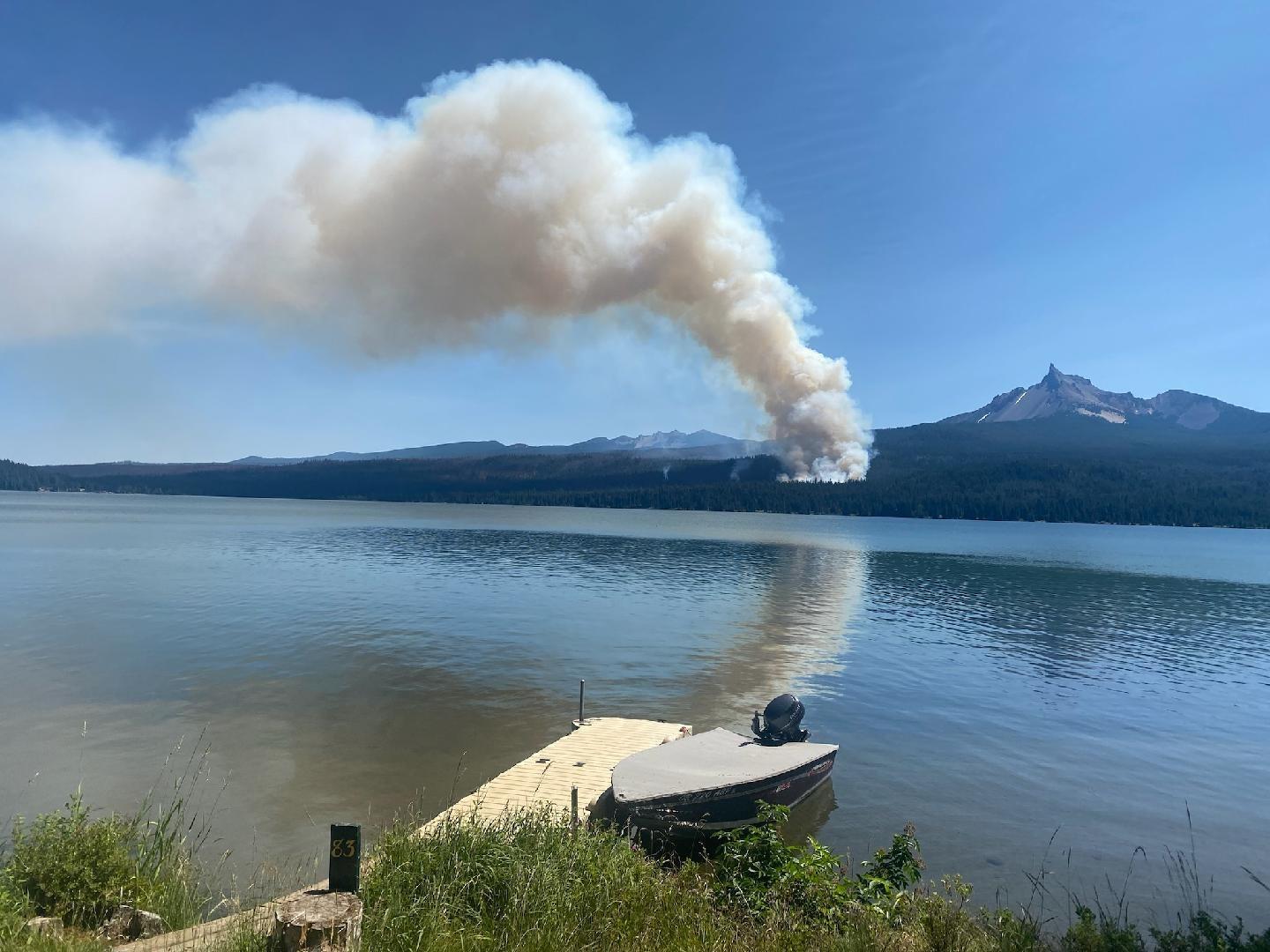 A helicopter has just started making water drops on the Trail Fire next to Diamond Lake. Just in time as the fire has already spotted in a few locations as you can see in this latest photo by Rick Schultze.