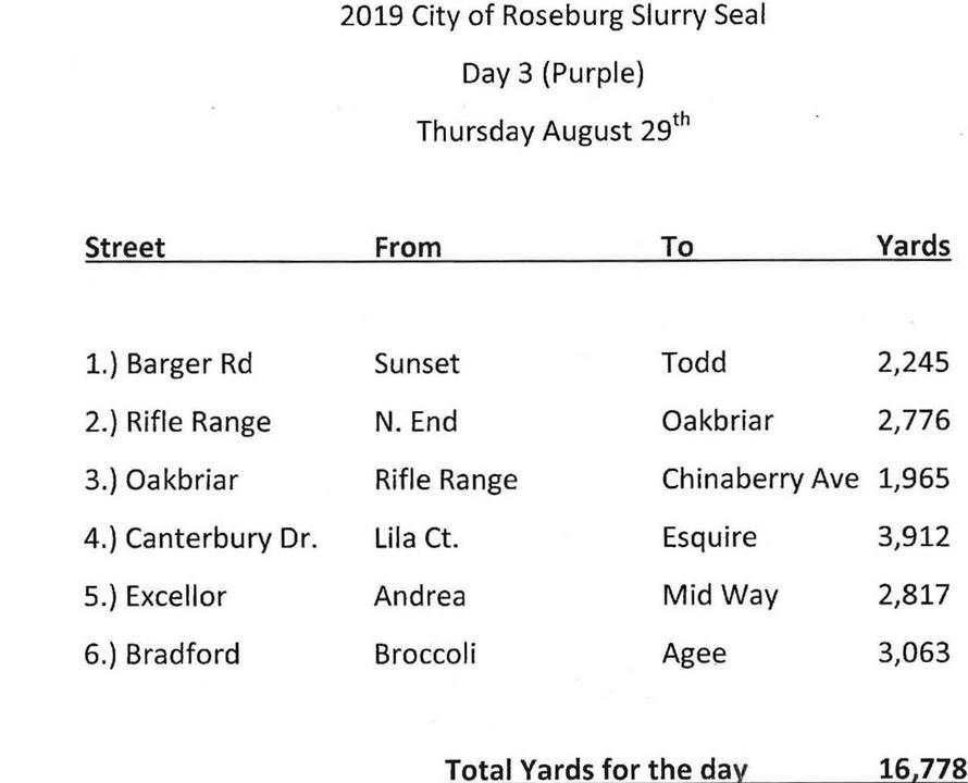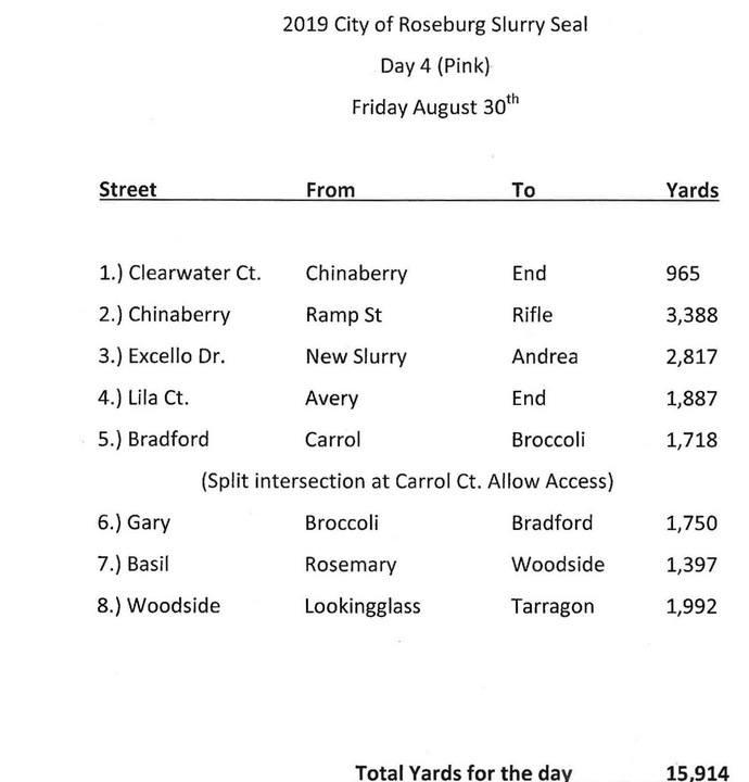 Construction will begin on Tuesday August 27 to slurry seal roughly 4.3 miles of residential streets throughout the City of Roseburg as part of this year’s annual pavement management project. A slurry seal is a very thin layer of aggregate with an asphalt emulsifier applied to a paved surface. Slurry seals are used primarily as preventative maintenance to prolong the life of the paved surface. The process requires all street parked vehicles to be removed from the impacted streets for one full day. Vehicular access will be restricted during the application and curing phase which lasts about 4 hours or more, weather dependent. The impacted streets will receive door hangers 48 hours in advance of the construction activities. All work is being performed by Pave Northwest, Inc. for a contract price of $209,070 and is expected to be complete within 1 week. More information is available by calling the City of Roseburg Public Works Department at 541-492-6730.