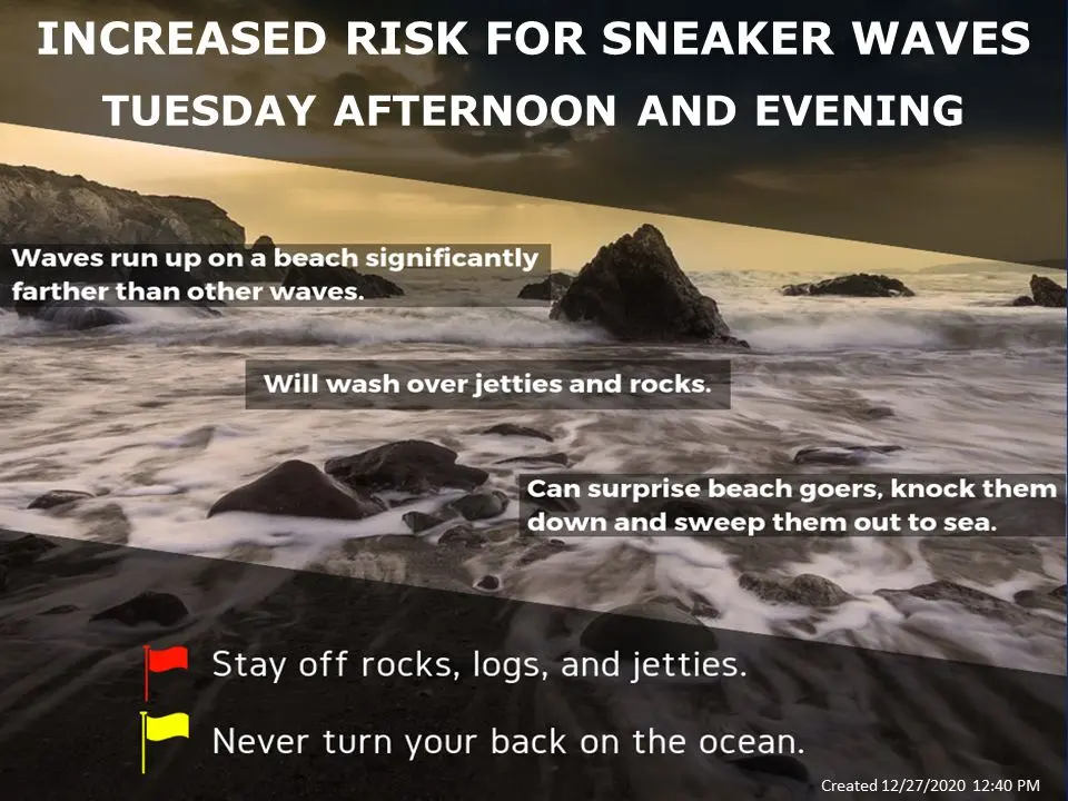 The Oregon Coast will see an increased risk of sneaker waves on Tuesday. A few weeks a video surfaced of a man and his dog almost being swept out to see before barely escaping a sneaker wave on the Oregon Coast. Just a good reminder to be very careful and not to turn your back on the ocean. Here's the statement from the NWS. "There is an increased risk for dangerous sneaker waves Tuesday afternoon and evening. Sneaker waves are waves that can surprise beachgoers, running up on beaches significantly farther than other waves or over outcroppings. Beachgoers can be knocked down and dragged into the very cold ocean by these waves resulting in injury or drowning. Logs and other debris can be tossed around and people can become trapped under them. If you see someone swept into the ocean, do not swim in after them."