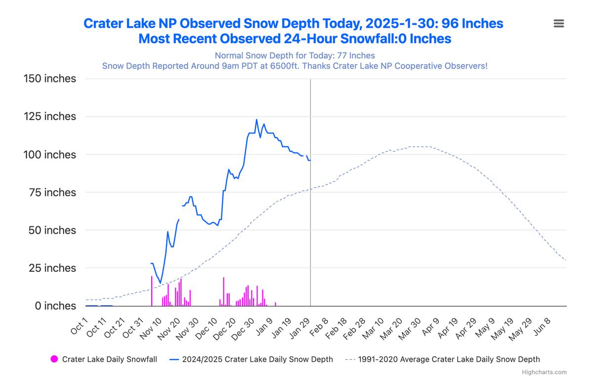 After 2-3 weeks of cold dry weather, precipitation is finally on it's way. Lots of rain and even some snow will fall at lower elevations, and lots of snow at higher elevations and we will have some windy conditions at times as well. Roseburg has the best chance of receiving some snow either Monday night into Tuesday morning or Tuesday night into Wednesday morning. Don't expect it to stick around very long as daytime temperatures will rise quite a bit. Crater Lake National Park currently has 96 inches of snow, which is 19 inches higher than normal for this time of year which is pretty impressive for not getting any new snow for weeks. This weekends storm could end up dropping 24-30 inches of new snow at Crater Lake according to forecasts from Friday through Sunday morning.