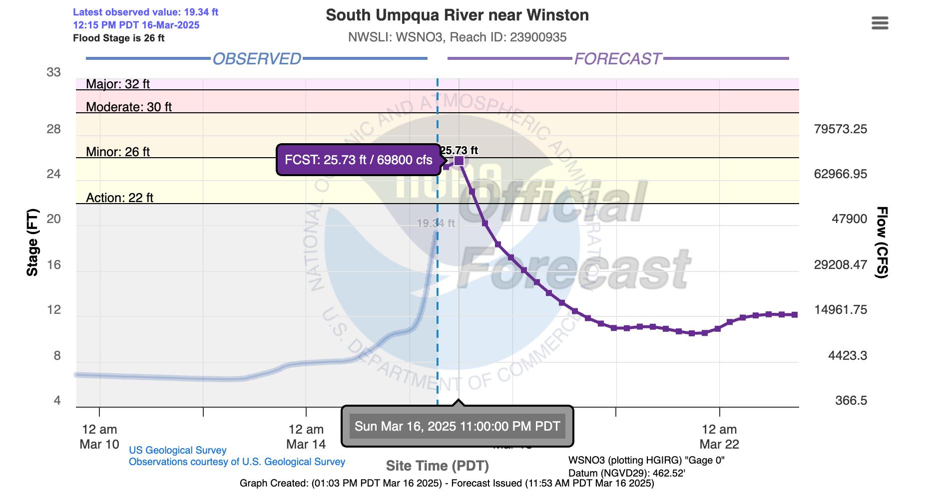 The big update early Sunday afternoon is the South Umpqua River is set to get very close to flood stage between 5-11pm this evening. Projections have the river reaching 25.73 feet now and flood stage is 26 feet. Remember, these are projections, and heavier rains could push water levels even higher as we keep seeing. More updates to come.