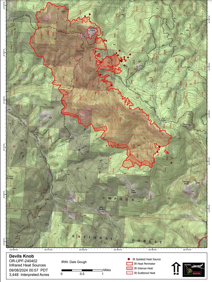 Devils Knob Fire - Tiller, OR: 3,448 acres, up 782 acres since Saturday (pictured above Sunday afternoon. Also, fire size was updated Sunday morning) Milepost 98 Fire - Canyonville, OR: 206 acres Yesterday on the Devil's Knob Fire, bucket work from aerial resources and engines supported ground crews along the 1610 road. Spot fires were established due to localized winds; fire crews are engaging in these areas to mitigate further fire spread. Active fire behavior and rugged terrain has made building direct line challenging. However, crews will continue to establish direct line where possible to minimize impacts to values at risk. Progression of the fire is terrain driven as fire backs down slopes towards the southeast. To protect buildings and other priorities, heavy equipment is building secondary indirect lines between structures and the fire. On the Milepost 98 Fire, crews worked to gain control of a slopover on the ridge near a communications tower. Today, firefighters will continue to dig line around the slopover and hold the northern edge of the fire. Movement is expected to be in the southwest direction away from the Interstate 5 corridor. Weather Next week, specifically Tuesday through Thursday, we are looking at increased cloud cover, significantly cooler temperatures, and widespread rainfall across the forecast area. Douglas County has a 40 percent chance of getting an inch or more of rain and a 73% chance of getting at least 1/10th of an inch of rain. Check out the full post here: https://www.roseburgtracker.com/posts/cooler-temperatures-and-rain-expected-in-douglas-county-next-week