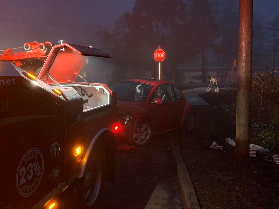 Around 1am in the morning of December 12th, 2019 the Roseburg Police Department investigated a reported burglary at the 420 Club, 2576 NE Stephens in Roseburg. During that investigation they learned several suspects gained entry into the business by damaging a window, gaining entry, and stealing merchandise from inside. Officers were able to identify a description of a vehicle of interest in that incident, and they provided that information to local law enforcement agencies. Just before 5am, an off duty Douglas County Sheriff's Office Deputy found the vehicle traveling on NE Stephens, and reported the information to on-duty Officers. Officers located the vehicle traveling north in the 2600 block of NE Stephens. The vehicle, a red Volkswagen beetle, then suddenly accelerated away from Officers, continuing northbound on Stephens. Speeds reached between 65-80 MPH, and Officers backed off because they were approaching a construction area north of Costco on Stephens. The suspect vehicle pulled further away at that time, but quickly tried turning east on Taft, losing control and striking a utility pole. Several occupants fled from the vehicle. One suspect, a 16 year old male, was tackled by law enforcement as he was trying to flee the scene on foot. The other people who fled were not located. K9 Nike from Roseburg PD attempted to track the other suspects, but they were not located. The 16 year old male was found in possession of merchandise stolen from the 420 Club, and he was later lodged at the Juvenile Detention Center for Burglary, Theft and Criminal Mischief charges. The vehicle sustained heavy damage during impact with the utility pole, and it was towed from the scene by Roseburg Towing. There is no evidence at this time that anyone was injured during the collision. The construction zone was also not active at the time of the incident. The investigation into the driver of the vehicle and other suspects involved in the burglary is still ongoing. Photo courtesy of Roseburg Towing