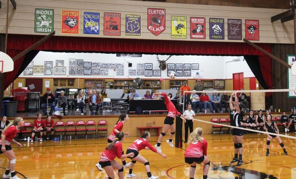 The Wolves are ranked No. 1 in the state according to the OSAA 1A power rankings. Set scores were 25-9, 25-12, 25-10. Days Creek (16-2, 7-0) has won all seven of their Skyline League matches and six in a row overall. Shandiin Newton had seven digs and Moriah Michaels added 15 kills for Days Creek. Ashtyn Slater added 14 kills while Megan Kruzic had 26 assists and six digs. Days Creek host Powers on Thursday at 6 p.m. Elkton (8-3, 7-2) who is in third place in the Skyline League north division plays at Umpqua Valley Christian on Thursday at 6 p.m. Days Creek's Moriah Michaels goes for a kill against Elkton's Aspyn Luzier. Photo courtesy of Debbie Fuller.