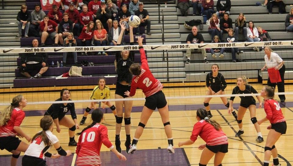 Set scores were 25-14, 25-17, 25-23. Senior Moriah Michaels had 10 kills and eight digs while fellow senior Joleen Crume had 16 kills and seven digs for the Wolves (29-3). Michaels and Crume both made first team all-tournament. Shandiin Newton had nine assists and Fiona Ketchem had five digs. Freshman Bailey Stufflebeam had eight aces. Ashtyn Slater had 10 kills and Megan Kruzic had 26 assists. Slater and Kruzic made second team all-tournament. “It was pretty exciting, we played good today,” Days Creek coach Gloria Kruzic said. “Our seniors have been rock solid all tournament long, they deserve a lot of credit. It was a fun day, we came out relaxed so I was really proud of them and it was a great way to end the season.” “Being able to end my senior year at final site and get 3rd in the state of Oregon is a huge goal and achievement for Days Creek volleyball,” Michaels said. “We’ve worked all season long for placing this high. We wouldn’t be here without our coaching staff, Gloria and Rachel as well as the love we have for one another on and off the court. We have given all the glory to God this season, that’s what has gotten us this far.” Days Creek beat Perrydale on Friday to advance to the semifinal against St. Paul but the Wolves lost in straight sets. “I have no regrets we played hard all weekend long,” Gloria Kruzic said. “Our goal from the beginning was we want to compete at state. I feel like we accomplished that, we didn’t fold we competed. I’m very proud of the season the girls have had. It’s pretty fun to coach when you have this great group of girls.” Days Creek went 14-0 in the Skyline League and won the league tournament along with the McKenzie tournament. Photo by Debbie Fuller of Moriah Michaels going for a kill against Perrydale.