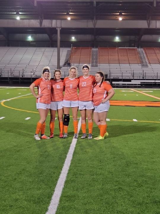 The Indians (2-7, 0-5) played an incredible first half according to Roseburg head coach Kristin Parks. “We were really offensive and they worked so hard. It was 0-0 at halftime which was our goal,” Parks said. “They scored in the 63rd minute off a six yard shot. Immediately after that goal, Madasyn Van Acker was taken down with no foul called.” Van Acker was out until the 77th minute which hurt the Indians offense due to an injury suffered in the takedown. “I am so very proud of their efforts and intensity tonight,” Parks said. “We are so close and we do so much more with our limited numbers. Madasyn Van Acker and Amy Carpenter get kudos for their play tonight. The girls gave 100%.” Freshman Amy Carpenter had 13 saves for the Indians. Roseburg plays South Eugene at home on Saturday on Finlay Field at 1 p.m. The Indians five seniors. Photo Courtesy of Kristin Parks.