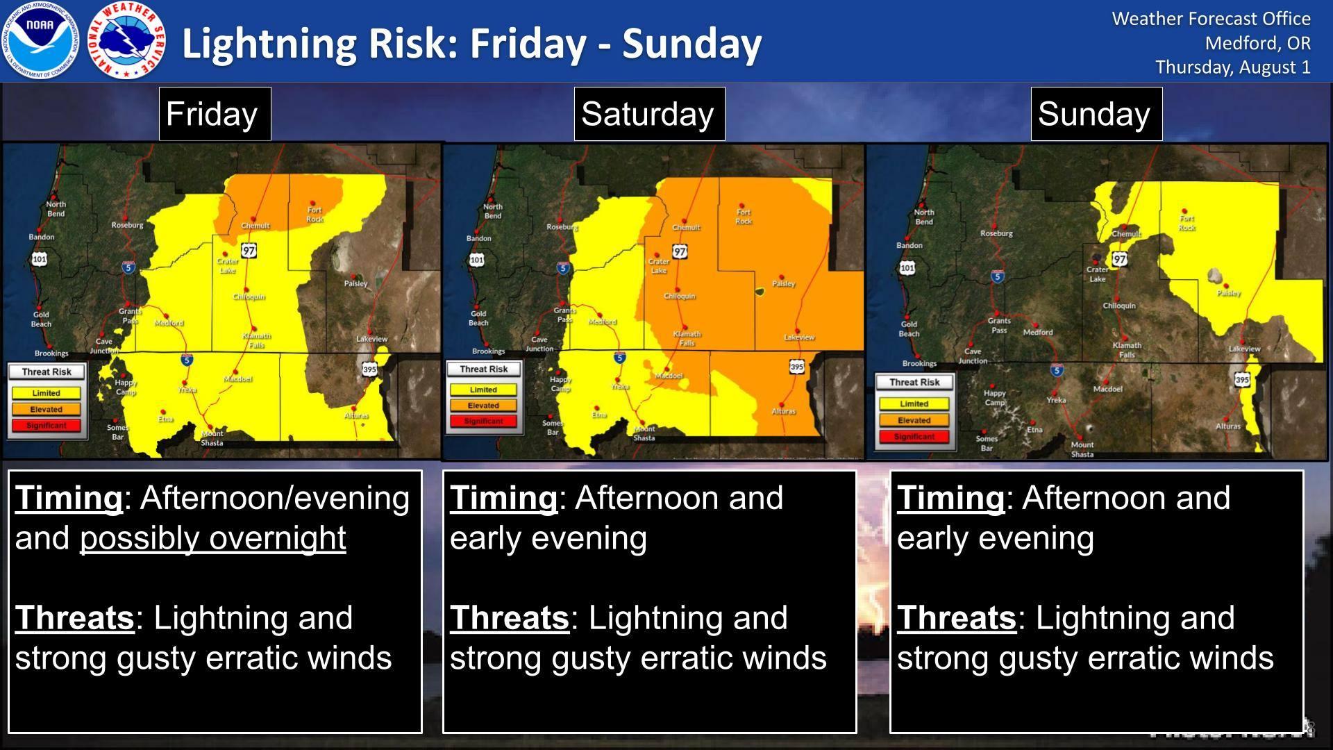 Thunderstorms will bring an increased chance for lightning through this weekend. Additionally, there will be a threat for gusty erratic outflow winds around 50 mph from any downburst/collapsing thunderstorms. Via NWS in Medford