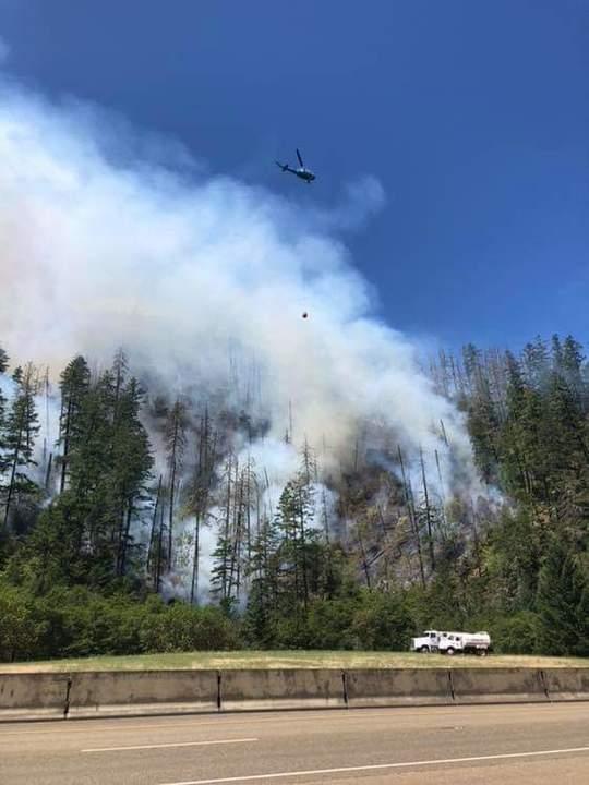 The fire is currently estimated to be 35 - 40 acres in size. Fire activity is starting to pick up as the temperatures increase. Currently, we have five helicopters working on the fire. Tanker 62 out of Medford has been ordered for another drop along the head of the fire and two additional Single Engine Air Tankers are on order as well. At this time, the fire is burning up hill and is not moving towards Canyonville. The southern flank of the fire has been more active this afternoon. If you are driving through the area, please slow down and pay attention! Safety for the public and our firefighters is our number one priority. Please do not take pictures or video of the fire while you are driving through the area and do not stop along side the freeway.