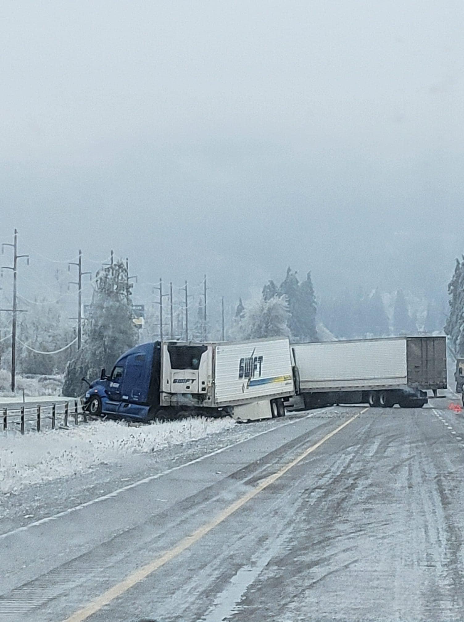 From ODOT: I-5 NB, MP 167-172: Icy conditions are causing multiple crashes and disabled vehicles south of Cottage Grove. Expect delays and use caution. Photo by April Lerl- Steele showing semi trucks wrecked in the northbound lanes around mile marker 170 or so.