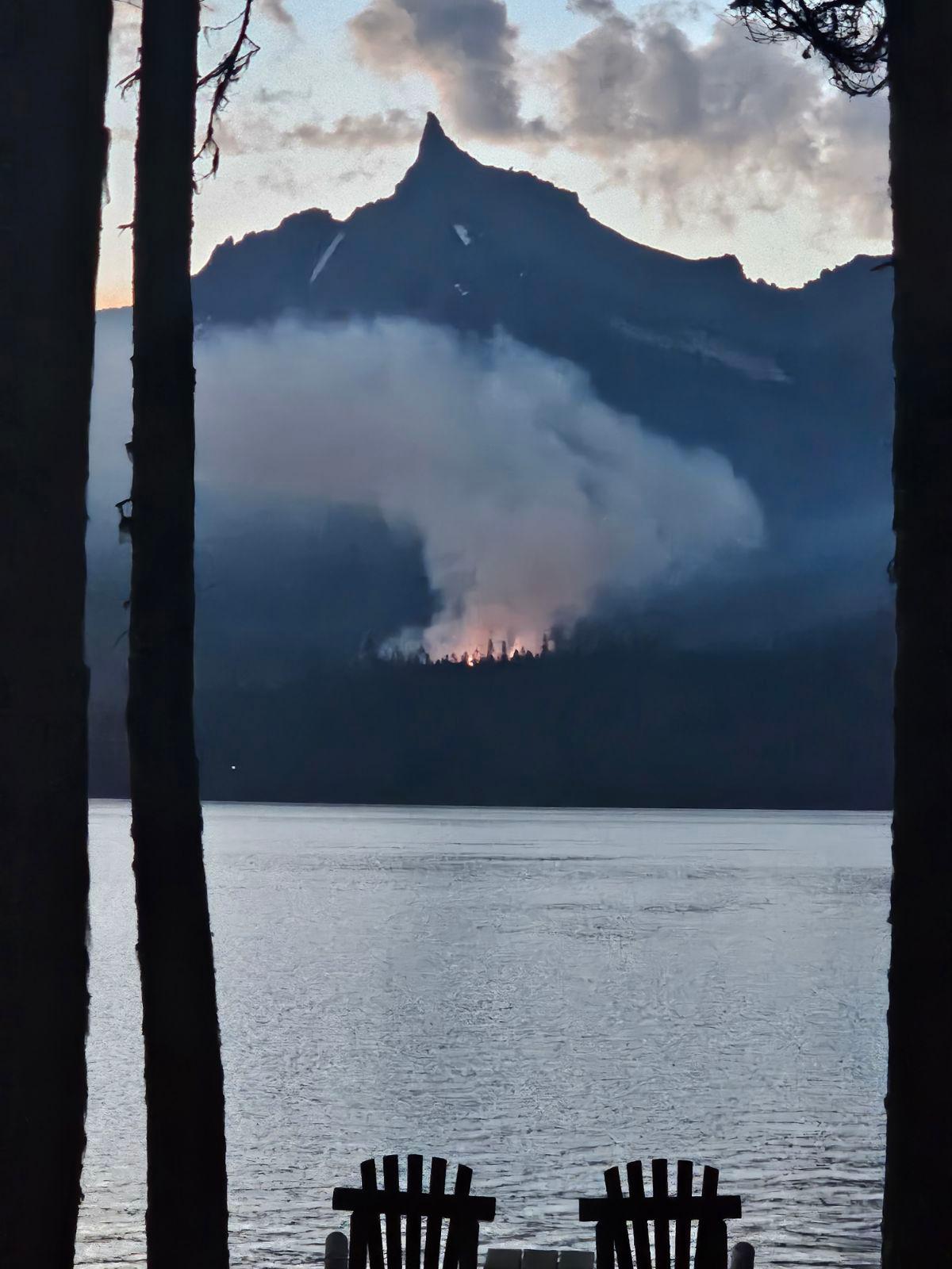 Update at 7:15 am: Fire is approximately 5 acres in size and is located about 300 feet from the highway. Engine and water tender is on scene, and hand crew on their way and a helicopter has been ordered. One fire started near Diamond Lake and Mount Thielsen last night. They are calling it the Trail Fire. More information to come as it becomes available. This photo was taken this morning by Toby Moser.