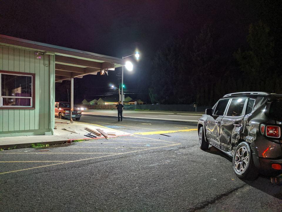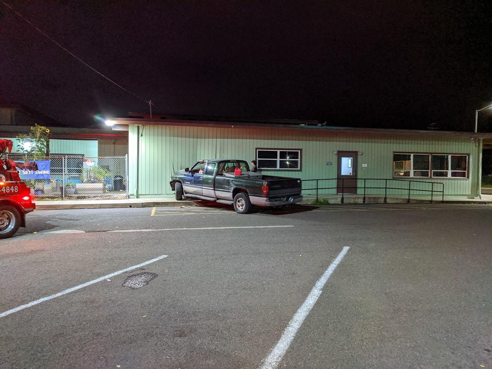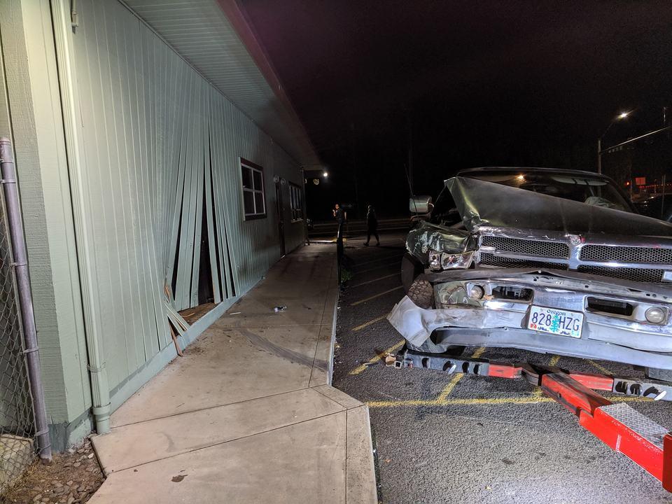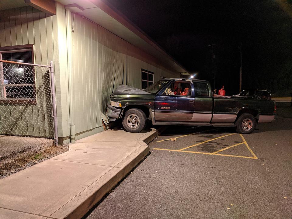 Shortly before 9pm this evening, a green Dodge Ram pickup was driving northbound on Stewart Parkway before doing a U-turn as it approached the intersection in front of the YMCA at Harvey. They then continued to turn and veered back across Stewart Parkway and into the YMCA parking lot taking out the breezeway posts and hitting another vehicle. After coming to a stop in the parking lot, the truck then gunned it straight into the YMCA down by the childcare building. The male driver and female passenger then got out and fled the scene before law enforcement caught up to them. If anyone saw the accident or saw anyone fleeing from the scene please contact Roseburg police department. Fortunately it does not appear there were any serious injuries.
