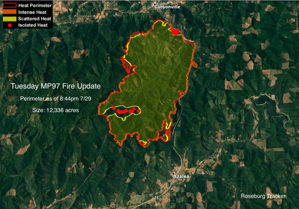 The Milepost 97 Fire grew another 668 acres in the past 24 hours but good progress is being made on this fire. That's approximately the same amount of growth acre wise as yesterday. The fire is now halfway between milepost 90 and 89. Three homes have been evacuated so far. There are still 586 structures that are threatened. Favorable weather again today will start out cloudy and a be a bit cooler again with high humidity before it burns off. Winds will not be as strong as yesterday which is good. 4-7 mph winds from the northwest with gusts up to 11mph. From DFPA this morning: "Firefighters are focusing much of the suppression effort on the south portion of the fire near I-5 to prevent further spread towards communities. Mop up operations have begun around the north end of the fire to further secure containment lines. Crews and equipment are also continuing to construct contingency control lines along ridges and existing road systems to the west of the fire. The use of aircraft continues to be effective on much of the fire. Air sup-port helps to cool the fire’s edge so that firefighters can gain closer access. Helicopters and Single Engine Air Tankers, or SEATs, are serving as the primary aviation resources on the fire. SEATs dropped 26 loads of retardant on the fire yesterday for a total of 18,549 gallons. Cooperators assisting ODF and DFPA on the fire include Roseburg and Medford BLM, the U.S. Forest Service, Cow Creek Tribe, Roseburg Re-sources, Silver Butte Resources, Lone Rock Timber, Williams Pipeline, Douglas County Sheriff’s Office, Oregon State Police, ODOT, and two Douglas County structure protection task forces." More info coming soon.