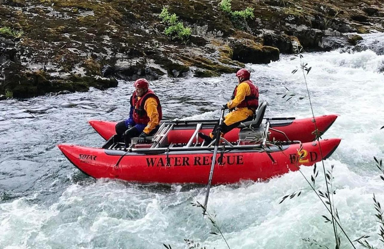 Here is the report of the incident from Douglas Co. Fire Dist. No.2: "At 2:41 p.m. Monday, Roseburg Fire Department (RFD) was dispatched to a water rescue in the area of Elk Island and requested the Technical Rescue Team from Douglas County Fire District No. 2 (DCFD2). Initial reports stated that a boat flipped over, and three people were in the water. Shortly after the initial report, an update was given to responders that two subjects were seen holding on to brush next to Elk Island, and one continued downriver. Roseburg Fire arrived at the scene, locating the two subjects holding onto the brush. Roseburg Fire established command, placed crews downriver for safety, and began coordinating with Douglas County Fire District No. 2 technical rescue team. The Technical Rescue Team from DCFD2 launched their paddle raft under the Oak/Washington Street bridge to gain access to the two subjects near Elk Island. They also deployed their Power Boat at Templin Beach Park to assist with the rescue efforts of the 3rd subject, who was reported floating down the river. The team successfully rescued the two subjects near Elk Island and was evaluated by Umpqua Valley Ambulance. Oregon State Police, Douglas County Sheriff's Office (DCSO), and DCFD2 continued rescue efforts with boats from Elk Island to Old Melrose/W. Goedeck Ave for the 3rd subject. The scene was turned over to DCSO. Roseburg Fire, DCFD2, and Oregon State Police responded to this incident with 3 engines, 3 rescue boats, 4 command vehicles, and 1 ambulance, totaling 26 personnel. Roseburg Police, DCSO, Oregon State Police, and Umpqua Valley Ambulance assisted fire crews." This post will be updated as more information becomes available. Photo courtesy of Nick Wecks of DCFD2