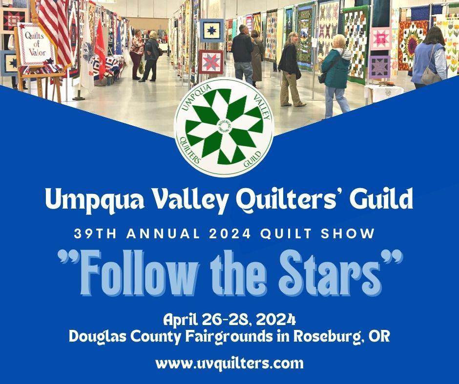 The Umpqua Valley Quilters' Guild is holding its 39th annual "Follow the Stars" Quilt Show this weekend, April 26, 27 and 28, at the Douglas County Fairgrounds. Doors open at 10 am each day. Come see over 300 quilts and nearly 20 vendors. Special Exhibits from Hoffman Fabrics' 100th Anniversary Challenge and Clark County Washington's Storytellers are included. Quilts of Valor will be awarded on Friday and Saturday at 11 am. Classes are offered as well. Rona Herman "Rona the Ribbiter", Featured Quilter and June Kuitert, Honored Quilter, will have booths to display their work and share their stories with you. Tickets are available online or at the door: Adults - $10, Youth 13-17 - $5, 12 and under are free. Go to www.uvquilters.org for further information, to sign up for classes or purchase advance tickets. The proceeds from the show help support donations of quilts and other comfort items to 11 groups and agencies in Douglas County. Via Umpqua Valley Quilters Guild