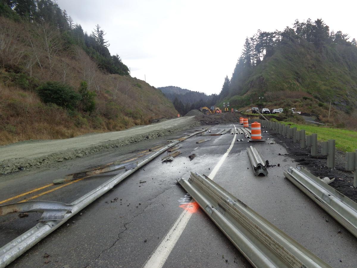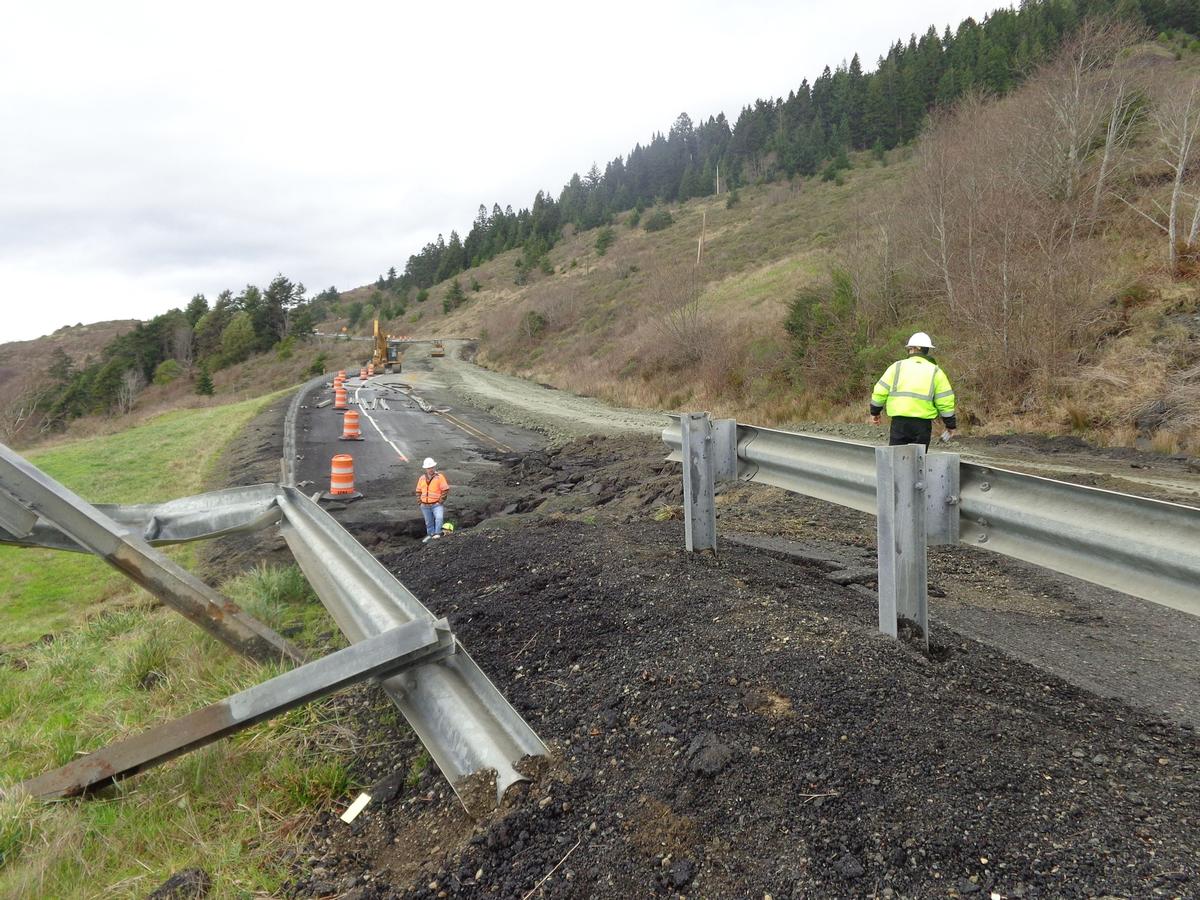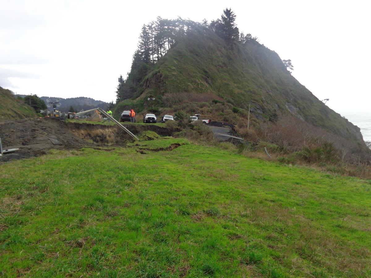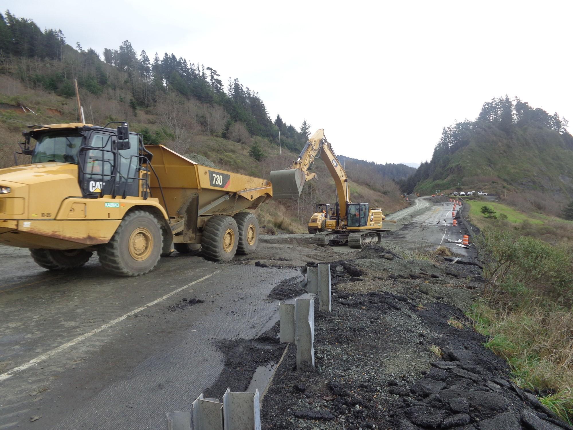 One lane of U.S. Highway 101 is expected to reopen by Friday afternoon (Jan. 13) to all traffic following a four-day closure due to a landslide. We expect one lane will be open tomorrow afternoon but bad weather could disrupt our schedule. Forecasted rain over the next 48 hours may slow work on the temporary lane under construction through the collapsed area of highway. Heavy rain could also saturate the ground and cause the landslide to move again, which would prompt a continuation of the closure. “We’re hopeful the weather cooperates and we can get the temporary lane finished and open by Friday afternoon,” said Glen Pederson, ODOT district manager. “We know how critical U.S. 101 is for access to local essential services, and we thank south coast residents for their patience this week.” U.S. 101 has been closed 12 miles south of Port Orford since early Monday morning. A landslide caused about 200 yards of highway to collapse 15 feet down and slide 12 feet west. A contractor is building the temporary lane through the collapsed section of highway using rock and gravel. Work began Wednesday and will continue through Friday this week, weather permitting. Traffic will be flagged through the single lane when it reopens, and travelers should expect delays and slower speeds through the area. Our staff and contractors will be closely monitoring the landslide when the temporary lane opens, watching for any more activity. They may close the highway again with short notice. Via ODOT