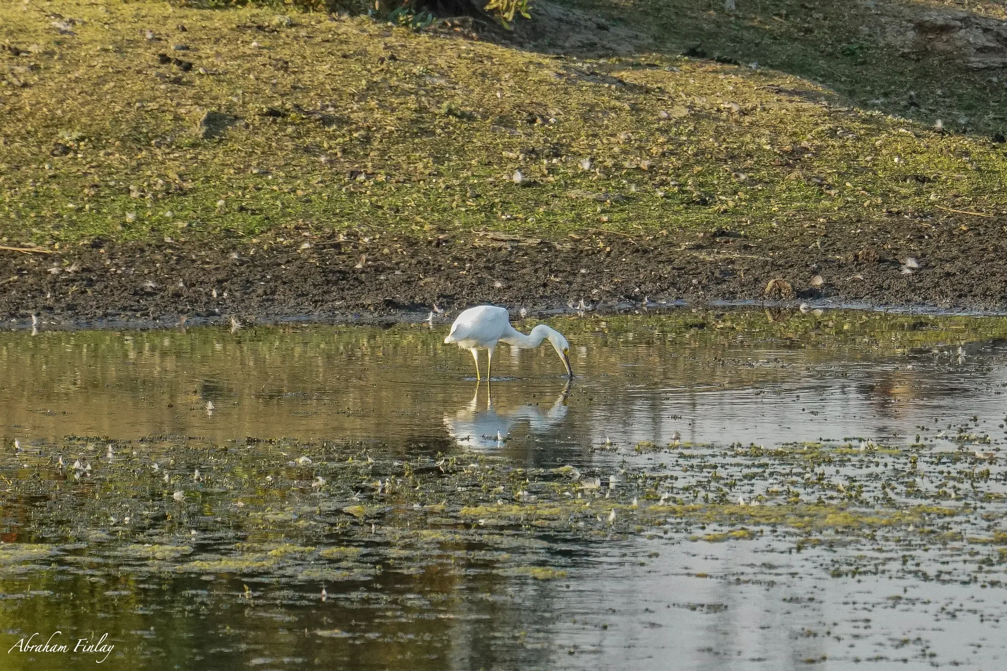 While I was at Fords Pond in Sutherlin yesterday, I spotted this very rare Snowy Egret hunting in the shallow water of the pond. The Snowy Egret eats mostly small fish along with a variety of other small aquatic insects. Snowy Egrets are not very common in Oregon especially in the Umpqua Vally area but if you know where to look you might catch a glimpse of one of these beautiful birds. A good place to look is Malheur Wildlife Refuge in late spring and summer. Snowy Egrets generally nest in trees. They build their nests out of small sticks, twigs, grasses, and other soft materials like leaves and moss to line the inside of the nest. Photo by Abraham Finlay Photo taken at Ford's Pond in Sutherlin