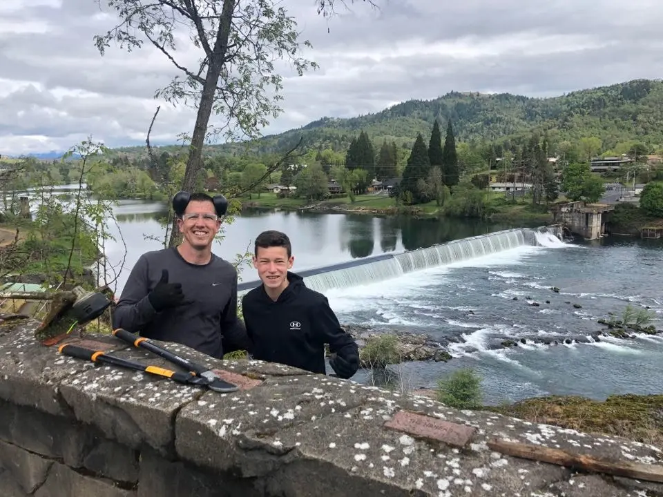 We had another successful landscaping and cleanup project today out at the Winchester Dam parking lot and around the viewing area grounds. 10 volunteers worked for 4-5 hours each this afternoon to get all the work done. The weather did not quite cooperate as it rained hard at times and made the cleanup take quite a bit longer than normal. We had two industrial mowers and five weedwhackers going most of the day and then a fleet of leafblowers at the end to clean everything up. Huge thank you to Scott Fenn and Ryan Burchell from S & R Yard Maintenance who brought out their two landscaping trucks and trailers full of all their gear. The work could not have been accomplished without them and their equipment! Also big thank you to Keith McDonald for your help and continued work and maintenance at this site. Thank you to Christina Ramage, Degan Clevenger, Jennifer Edge, Moses Finlay, Elijah Finlay and Abraham Finlay for all your hard work this afternoon! We had pizza afterward for all the volunteers through a kind donation from Luann Urban. Thank you Luann!