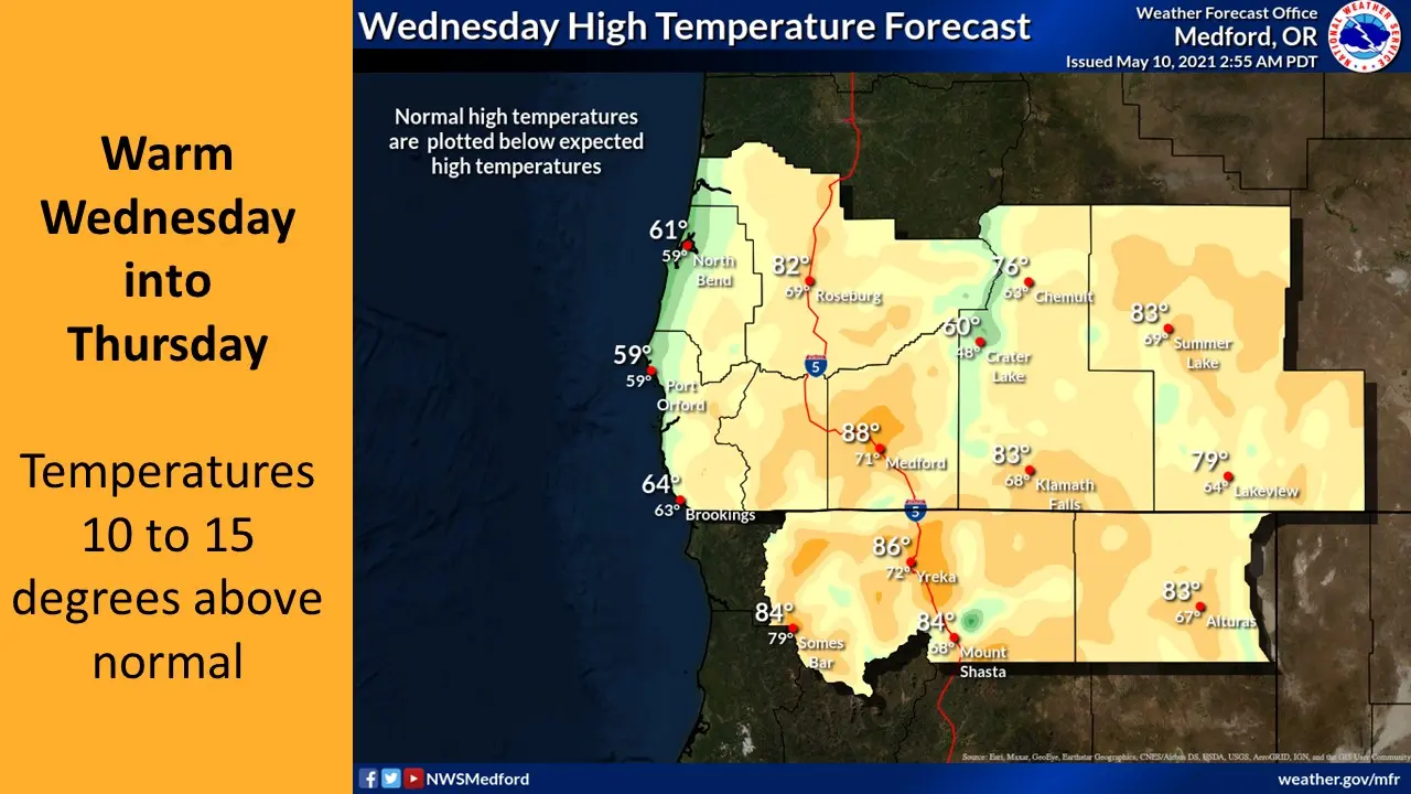 More warm temperatures are heading our way this week. Temperatures could reach the mid to low 80's by Wednesday and Thursday in Douglas County before cooling down a bit. Here is the latest from the NWS out of Medford. "Temperatures will peak this week on Wednesday and Thursday with high temperatures expected to be 10 to 15 degrees above normal for most inland areas." Our drought conditions meanwhile continue to worsen. As you can see from the image below, we are now down to 41% of our normal snow water equivalent. Here is their latest discussion: https://www.wrh.noaa.gov/total_forecast/getprod.php?new&prod=XXXAFDMFR&wfo=mfr