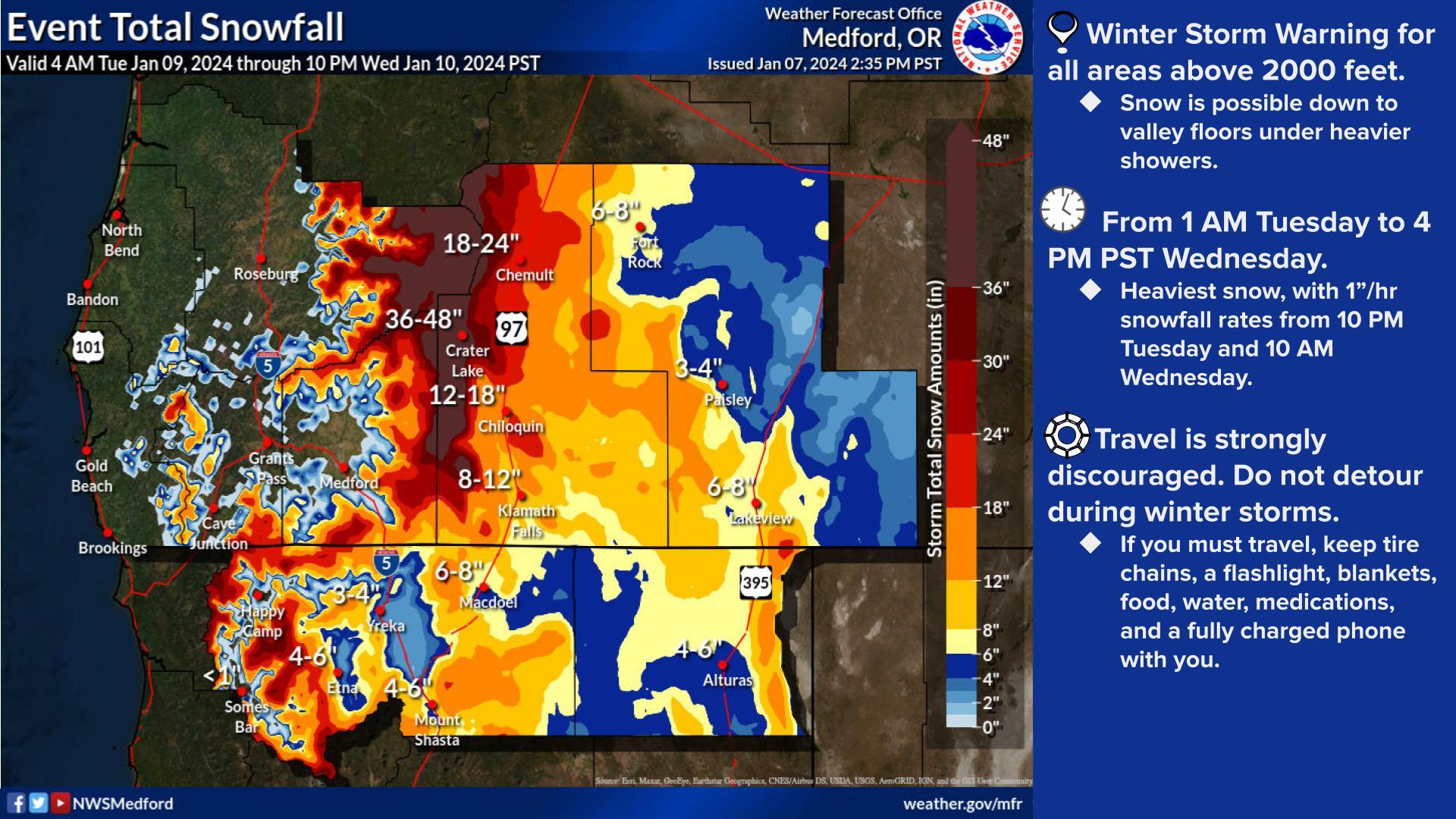 A winter storm warning has been issued for higher elevations in Douglas County beginning early Tuesday morning and lasting until Wednesday afternoon. 1-2 feet of snow could fall and very high winds are expected. Here is the full warning from the National Weather Service. Issued: 2:12 AM PST, Monday, January 8, 2024 Duration: From 1 AM Tuesday to 4 PM PST Wednesday. Altitude: Above 2000 feet. Conditions: Snow and Wind: Heavy snow and blowing snow. Accumulation: Up to 12 inches, with 24 inches possible in the highest areas. Wind: Gusts up to 55 mph. Affected Areas: Foothills of Cascade, Siskiyou, and Klamath mountains in Douglas, Jackson, and eastern Curry counties. Areas include Tiller-Trail highway and parts of Interstate 5 and highways 62 and 140 above 2000 feet. Impacts: Difficult or impossible travel conditions. Potential whiteout conditions due to blowing snow. Likely to affect morning and evening commutes. Additional Concerns: Possible significant impacts on Interstate 5 passes between Grants Pass and Canyonville, especially if snow levels drop 100 to 200 feet lower than predicted. Highest risk times are Wednesday morning and evening. Safety Recommendations: Travel is strongly discouraged. Avoid detours during storms. If travel is necessary, carry tire chains, flashlight, blankets, food, water, medications, and a fully charged phone. Stay indoors if possible. Warning Details: A Winter Storm Warning indicates severe weather that threatens life and property. Take immediate protective actions. Here is the latest forecast discussion: https://www.weather.gov/wrh/TextProduct?product=afdmfr